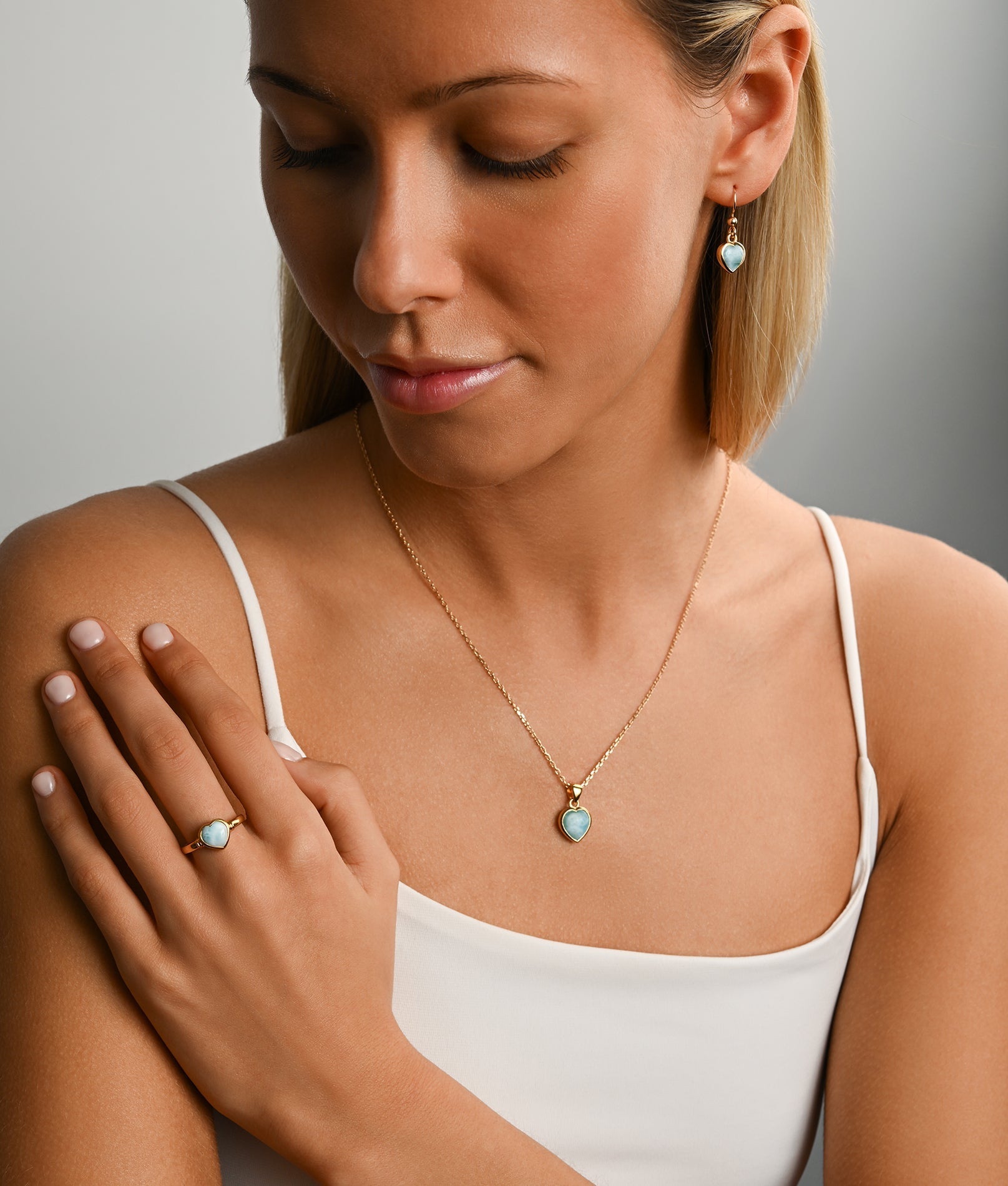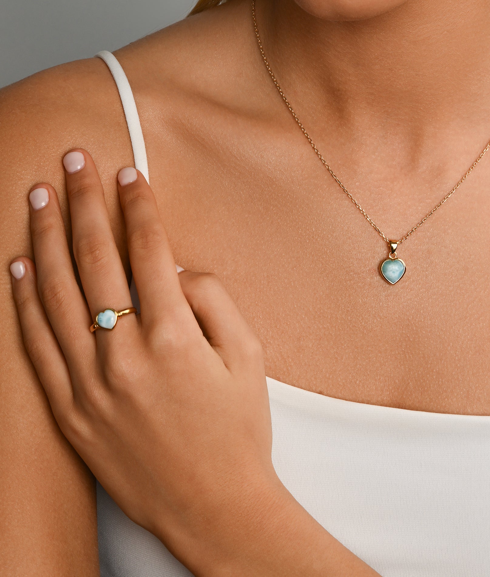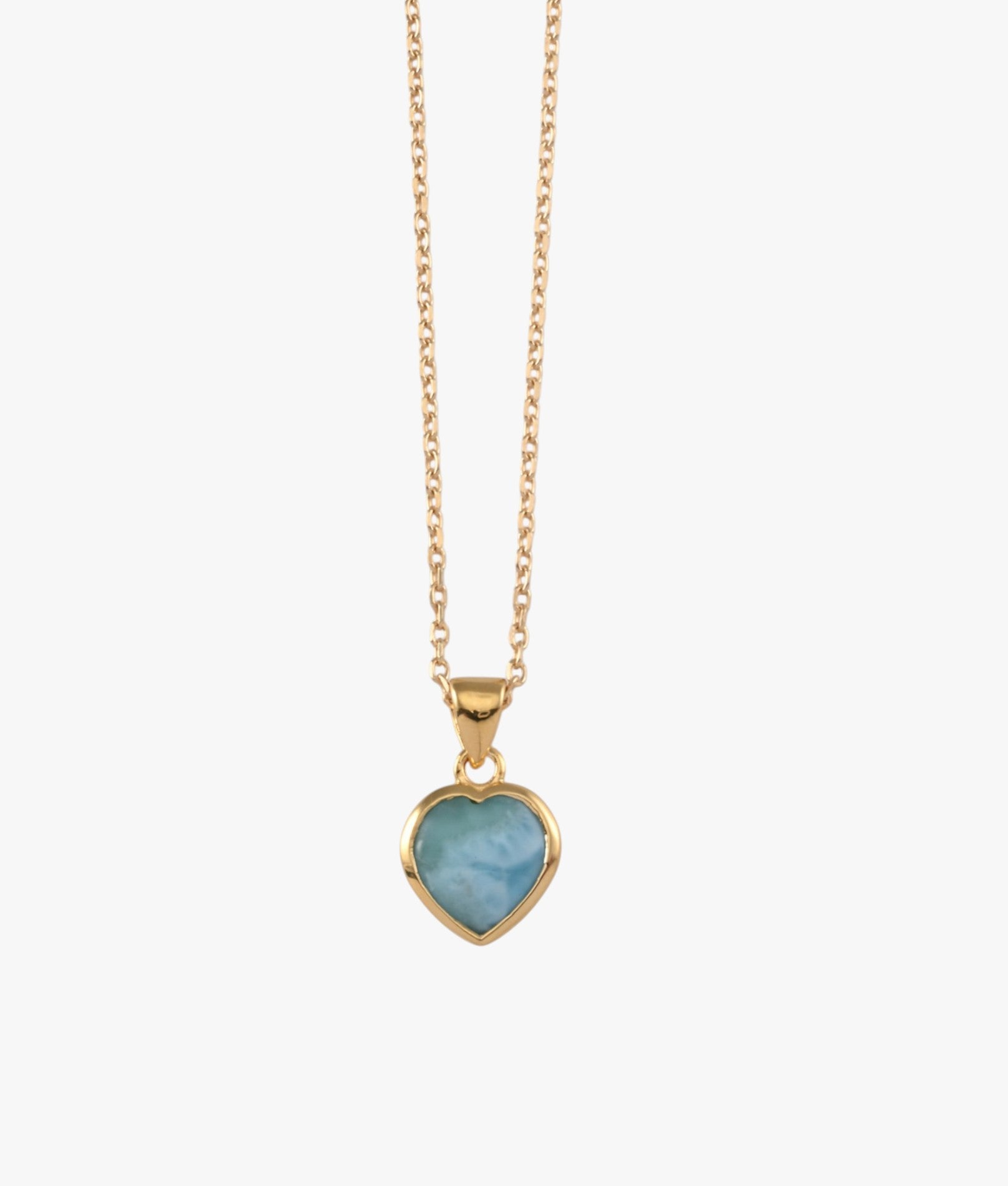 Soft blue meets warm gold. This adjustable belcher chain necklace features a large heart-shaped Larimar pendant - a rare gemstone formed in Caribbean volcanic rock, known for its ocean-inspired hues and natural marbling. Adjustable length makes it perfect for layering or standalone wear.