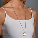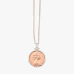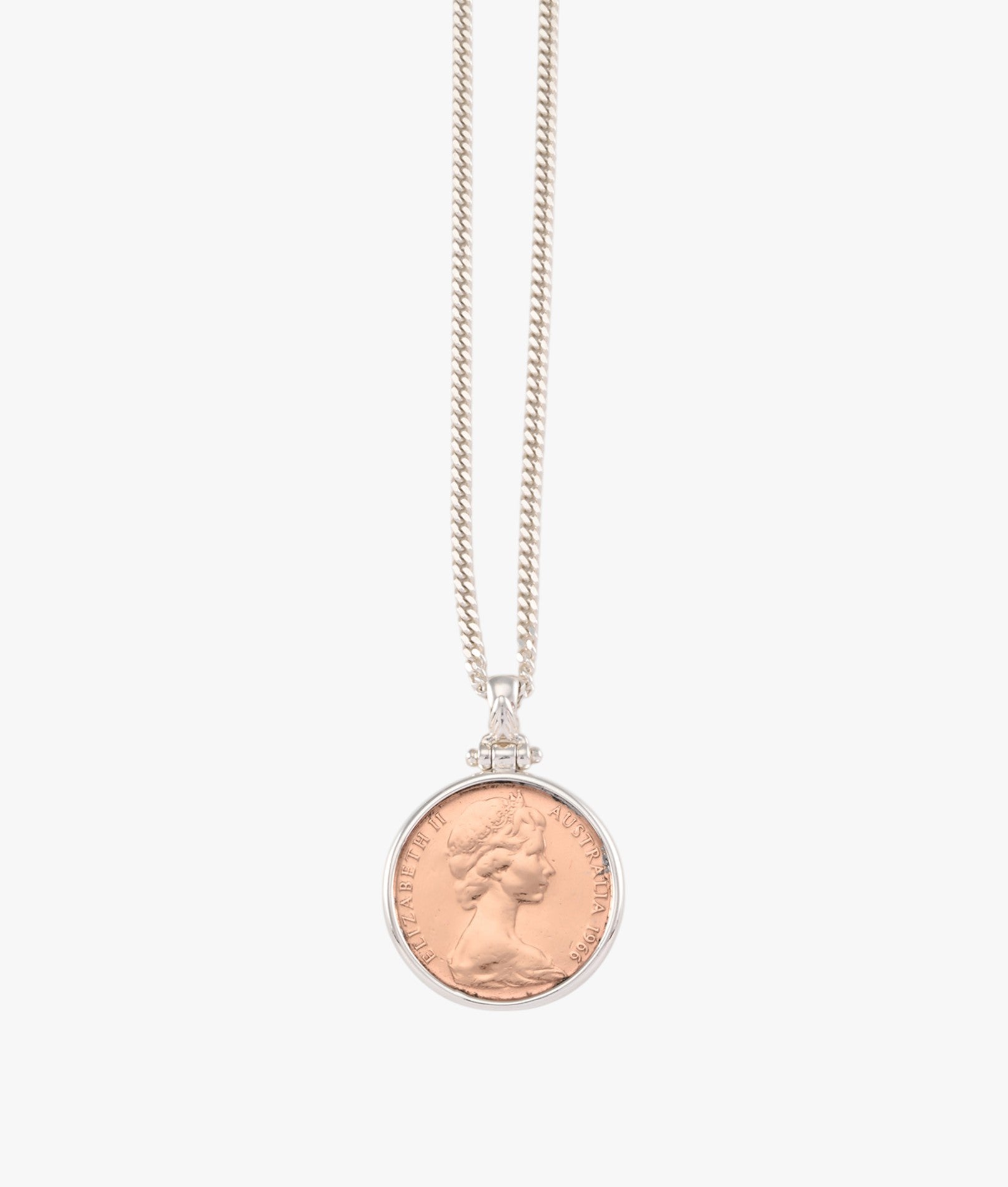A fine flat curb chain necklace featuring an authentic Australian two cent coin, hinged to move gently as you wear it. A statement in understated nostalgia.