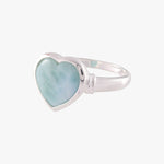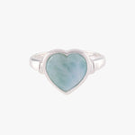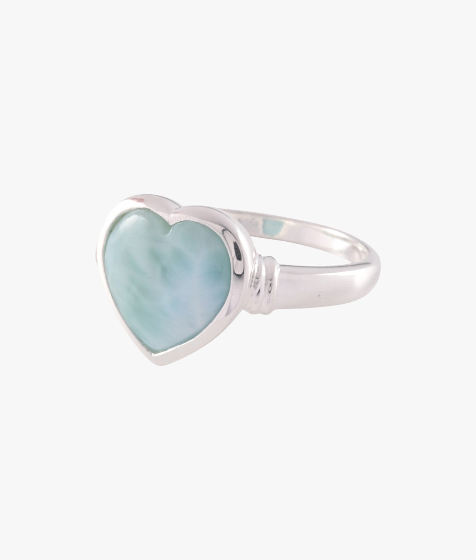 Cool blue meets timeless silver. A large heart-shaped Larimar takes centre stage on a polished sterling silver band - known for its soothing ocean hues and unique natural marbling. A bold expression of calm elegance.