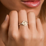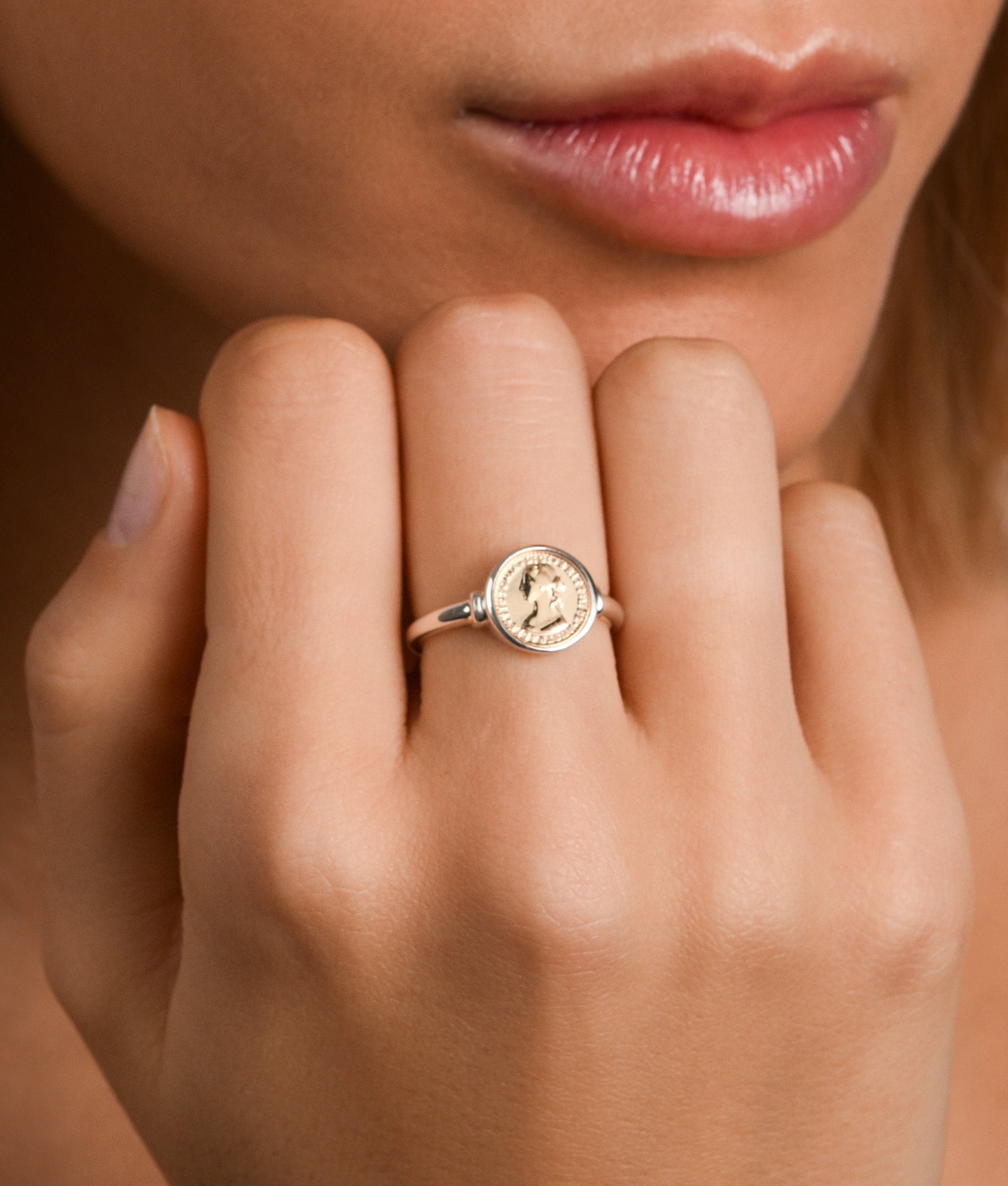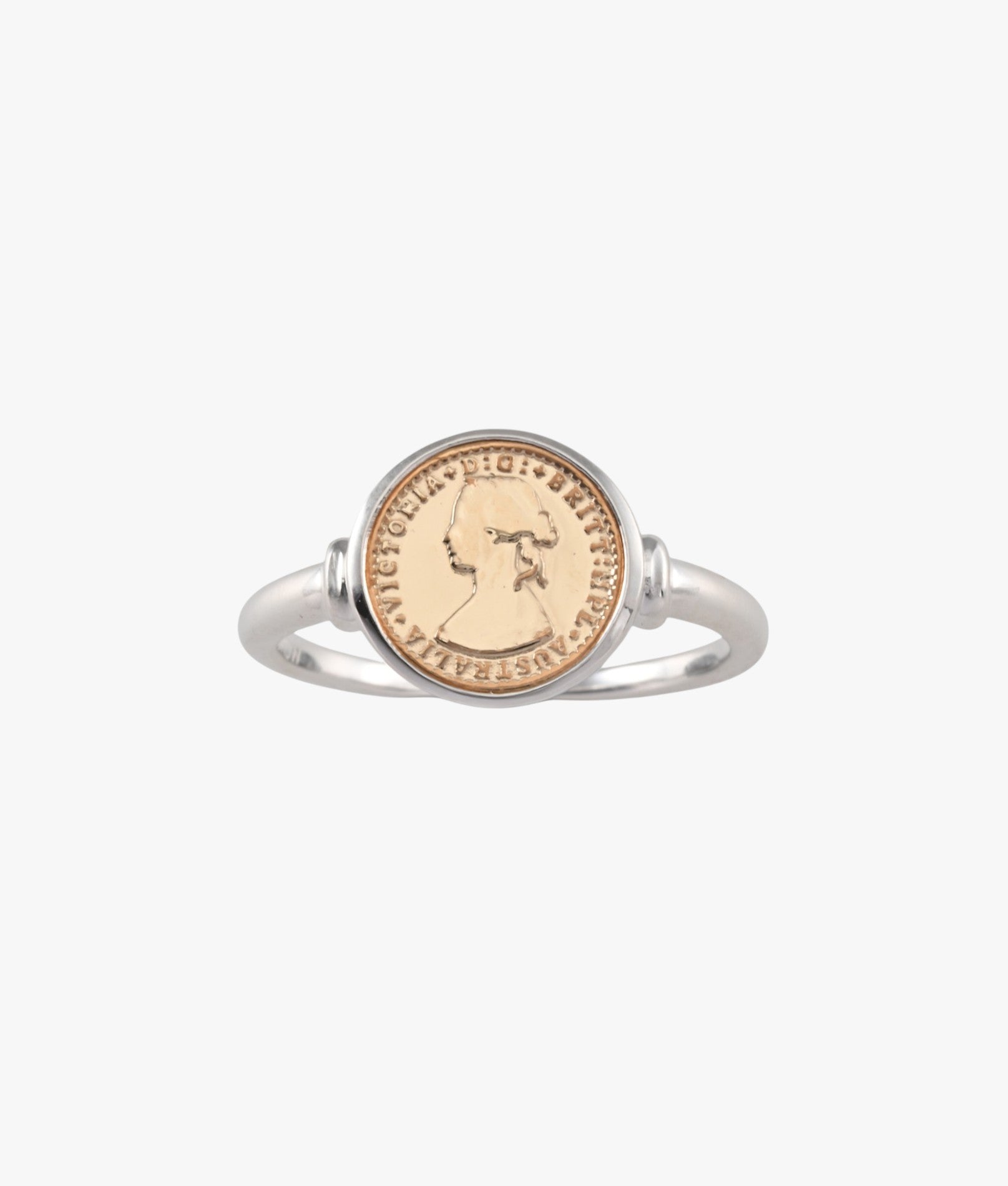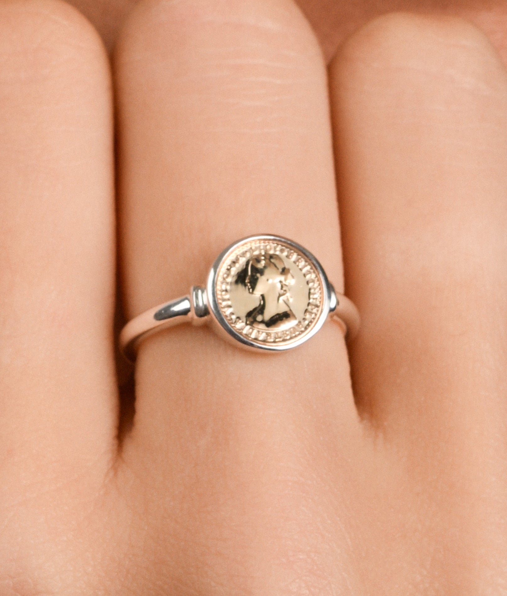 A subtle contrast in miniature form. This fine ring features Von Treskow’s gold Micro coin token, set in a polished bezel for a refined two-tone finish. Delicate proportions make it perfect worn alone or as a pinky ring.