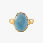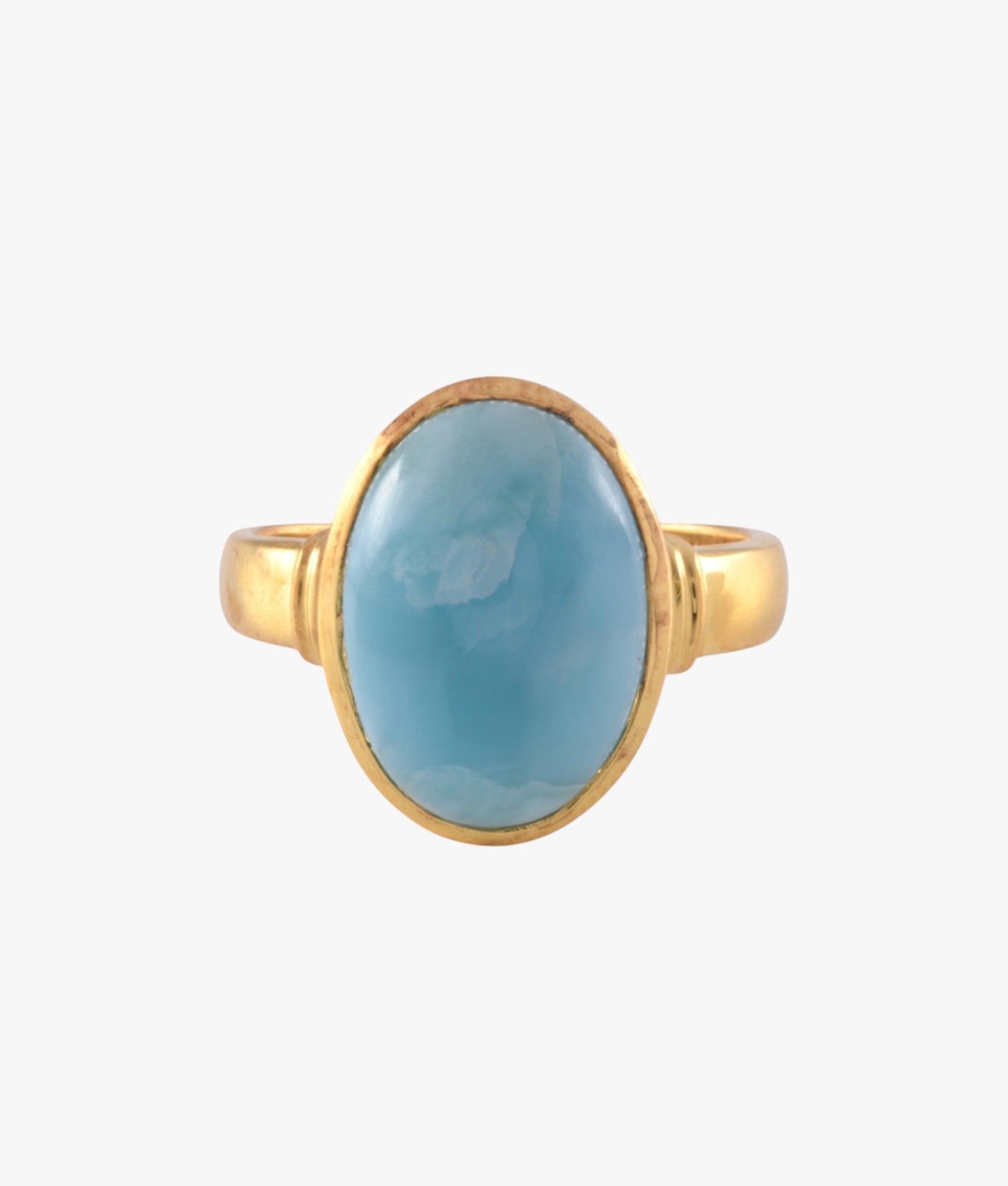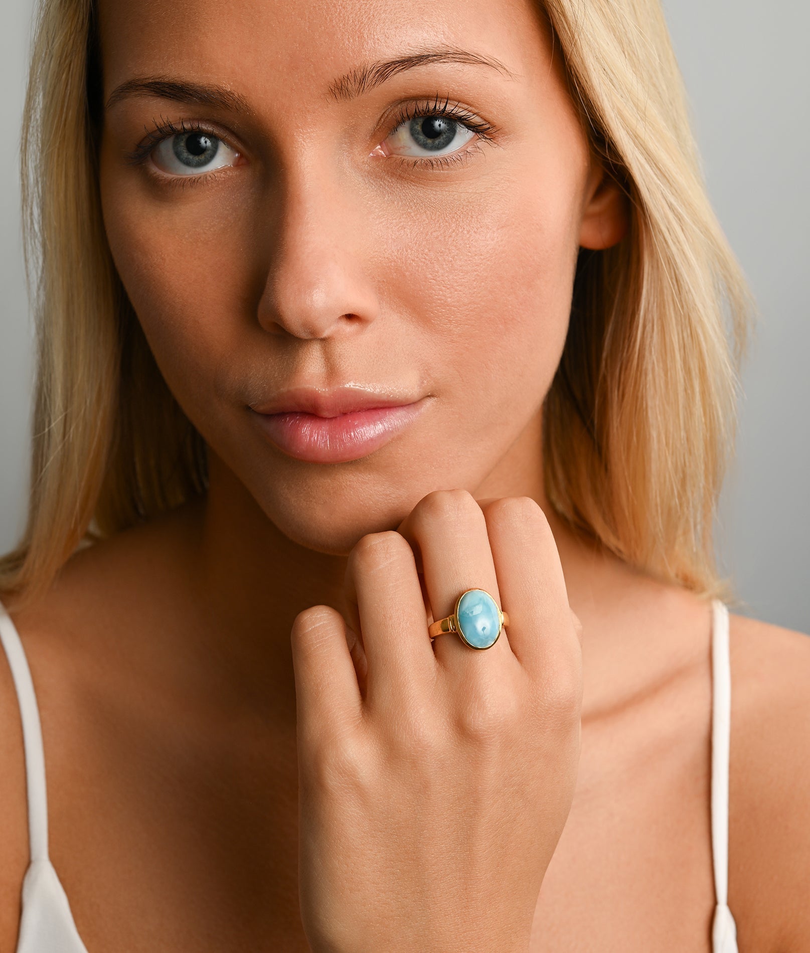 A statement in sea and gold. This bold oval ring showcases natural Larimar - a gemstone prized for its tranquil blue tones and unique marbling - set in polished yellow gold plating. Effortless elegance with a touch of the tropics.