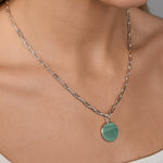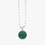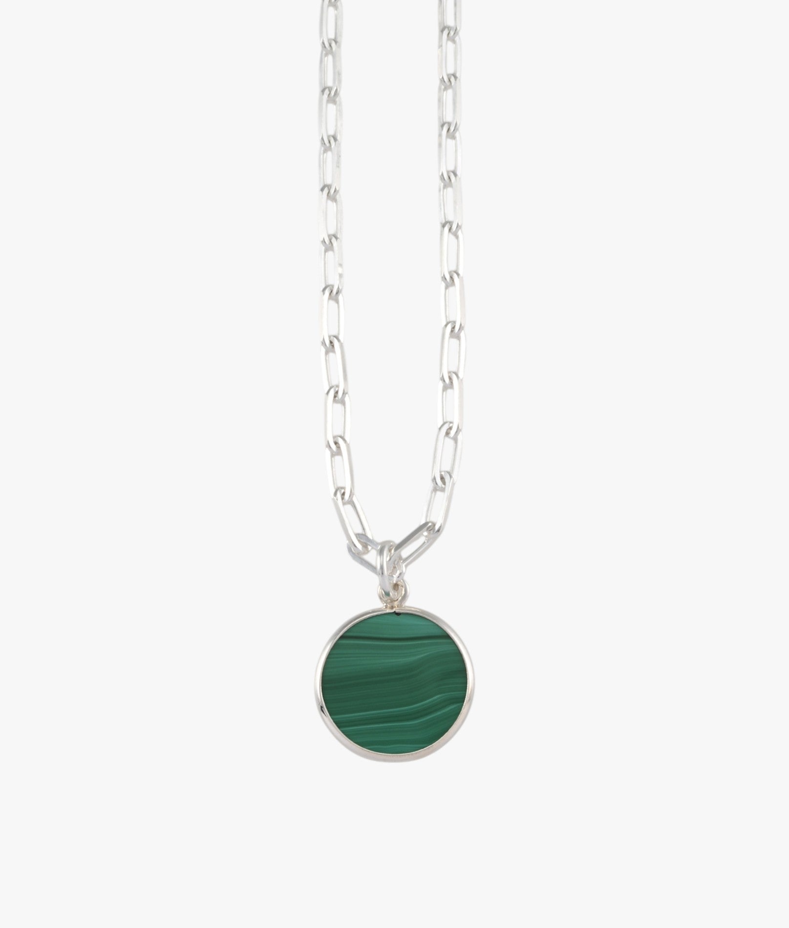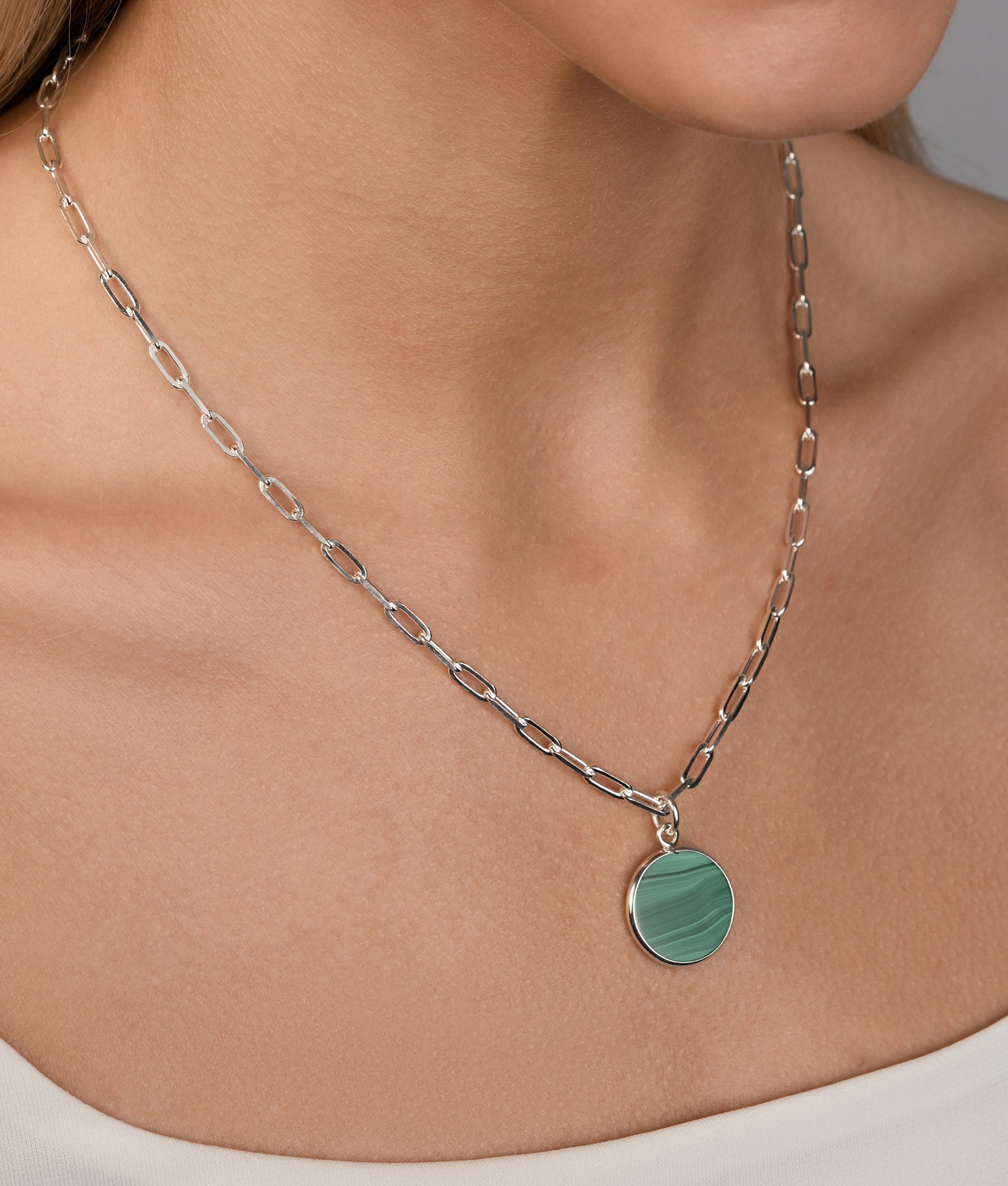 A fine clip chain necklace featuring a round Malachite pendant - each stone distinct in its tonal bands and natural depth. Minimal, refined, and made for everyday wear.