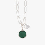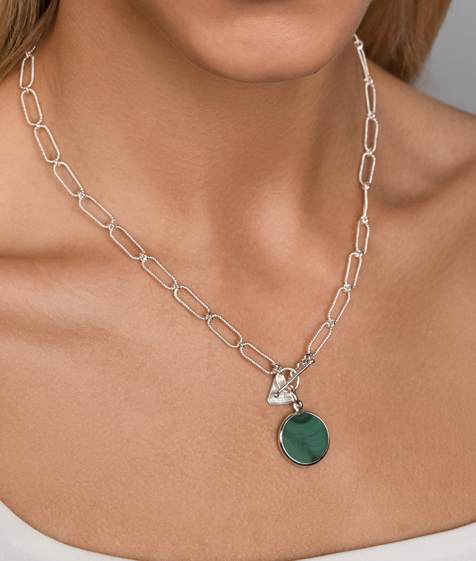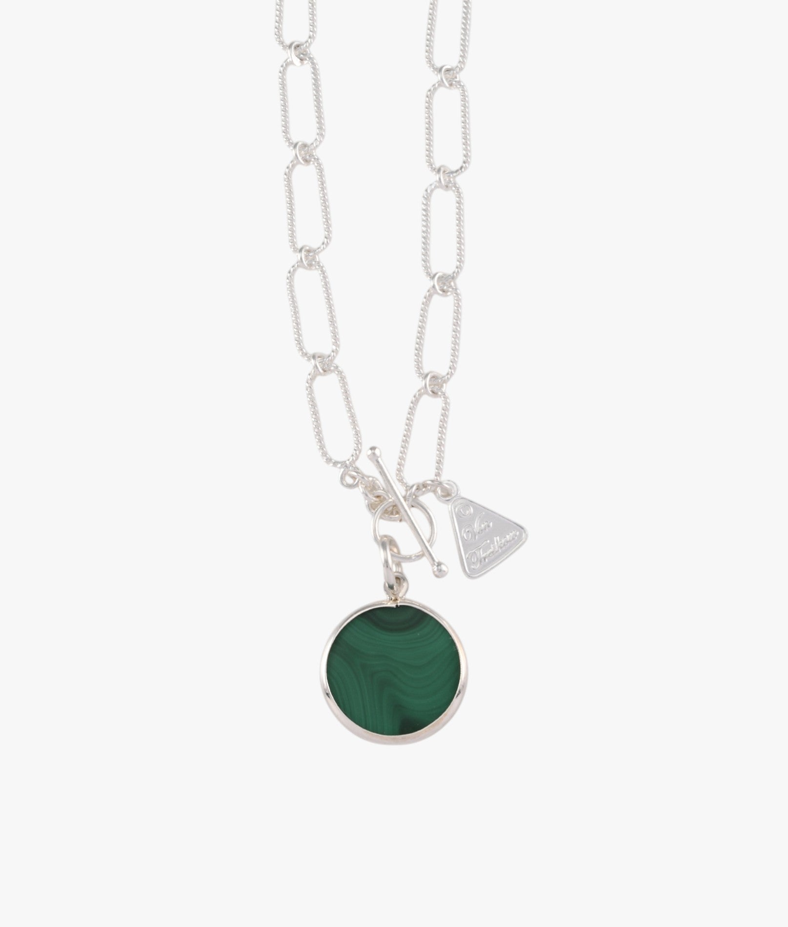 A fine open-link chain necklace set with a round Malachite pendant - defined by its deep green hues and natural banding. A subtle statement with everyday appeal.