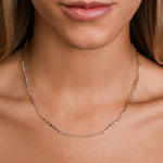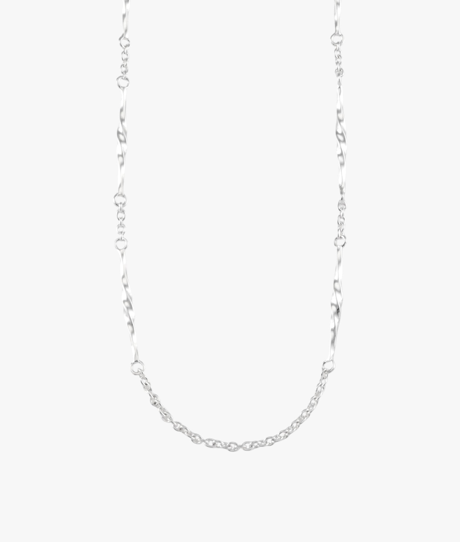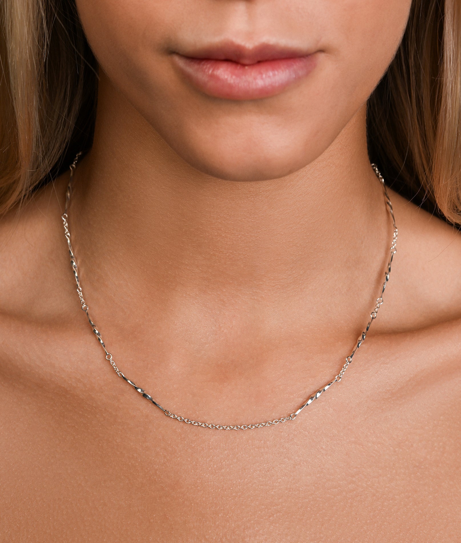 Sleek and sculptural. This necklace features a segmented twist design that reflects light with subtle movement. A refined piece with a modern, polished finish.