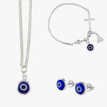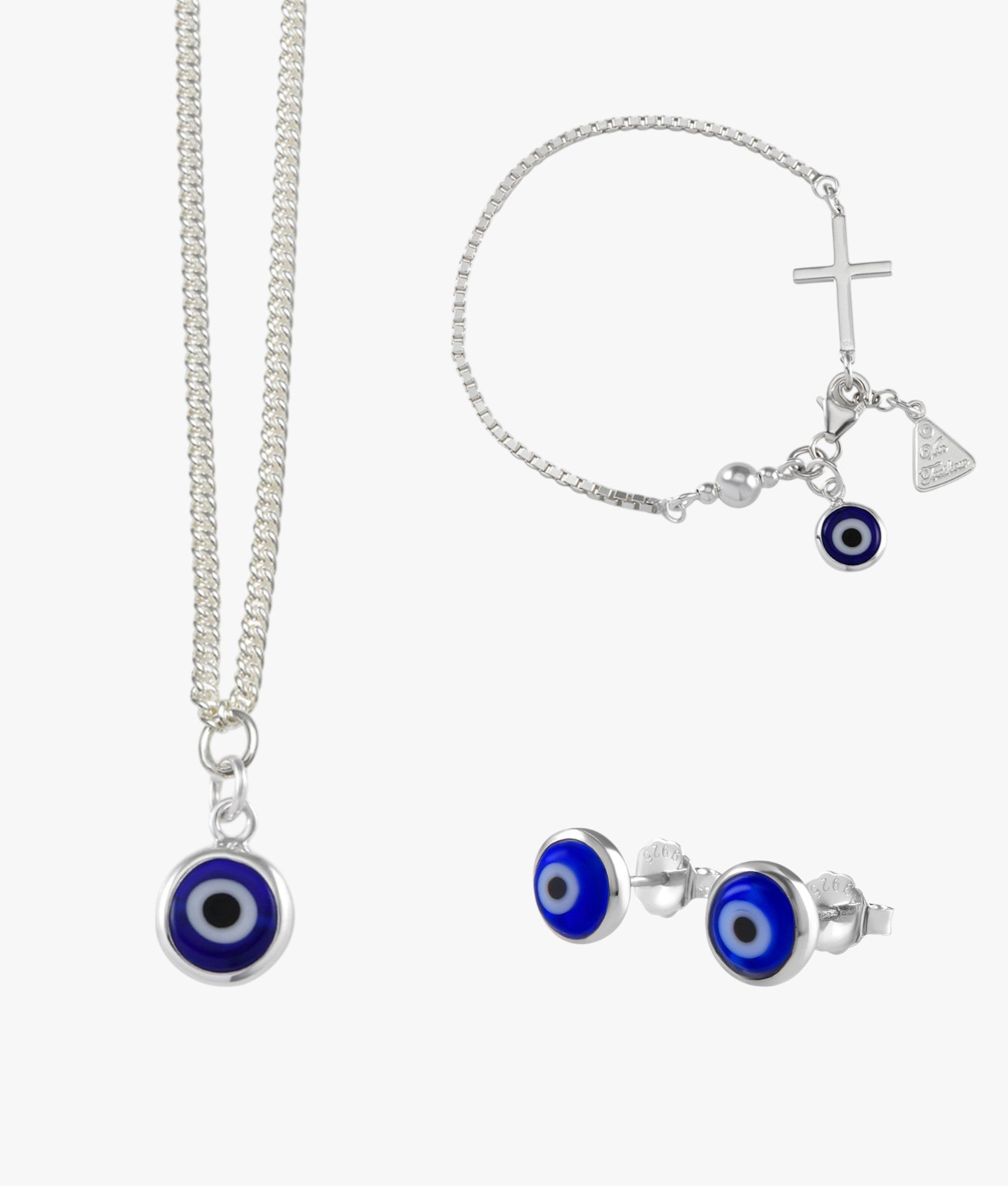 A symbolic trio designed for everyday protection and style. This curated bundle unites three signature pieces - a curb chain evil eye necklace, a box chain bracelet featuring the evil eye and cross, and matching studs. Clean lines and meaningful motifs make this a set you can wear daily or mix into your existing stack.