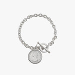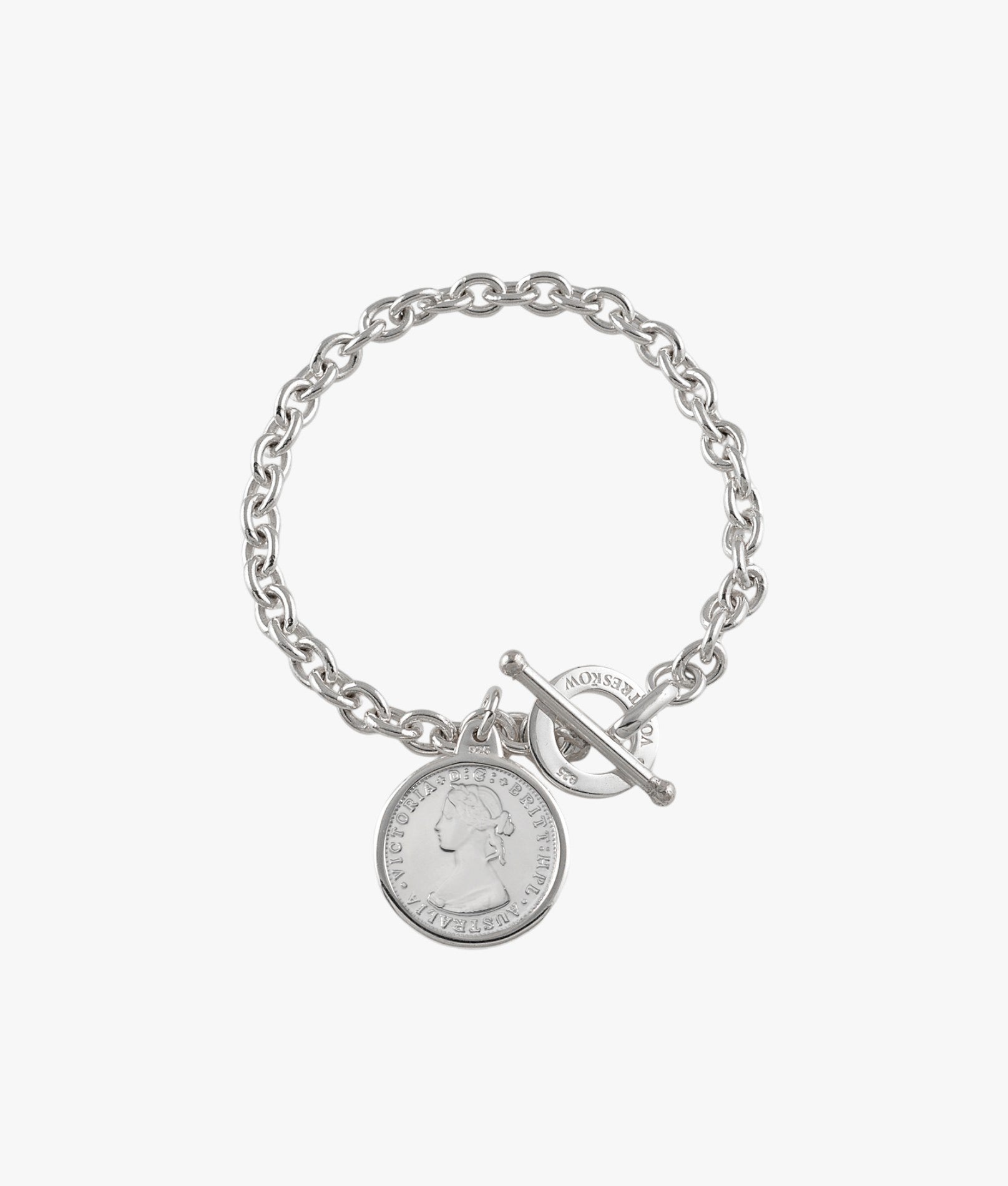 Oval belcher bracelet with sixpence sized Australian token coin.