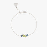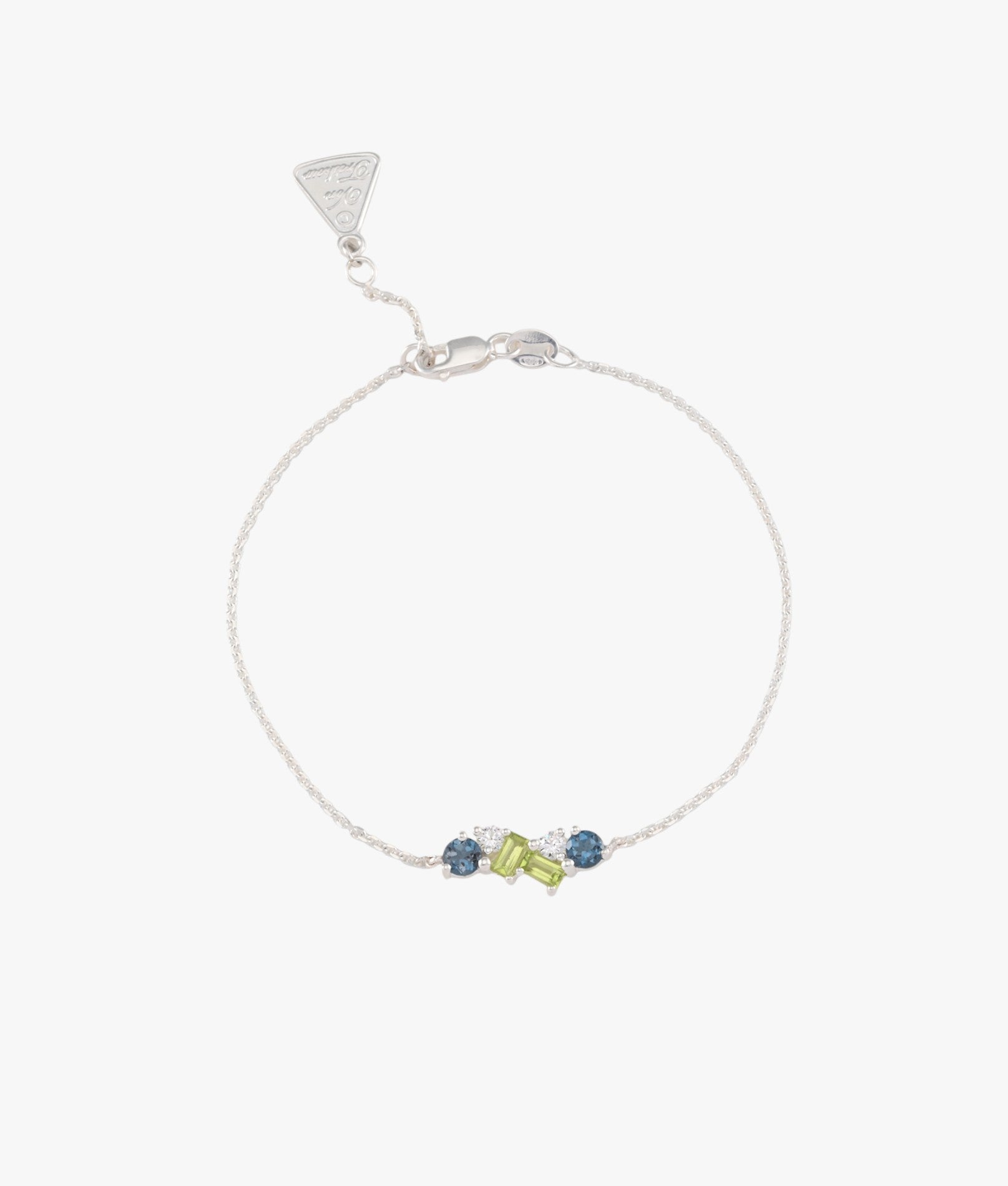 A fresh mix of colour and sparkle. The Lime & Berry Quartet Bracelet features two round-cut London Blue Topaz stones, a baguette-cut Peridot, and a round Cubic Zirconia accent. Set along a fine sterling silver chain, this four-stone design balances bold colour with everyday wearability.
