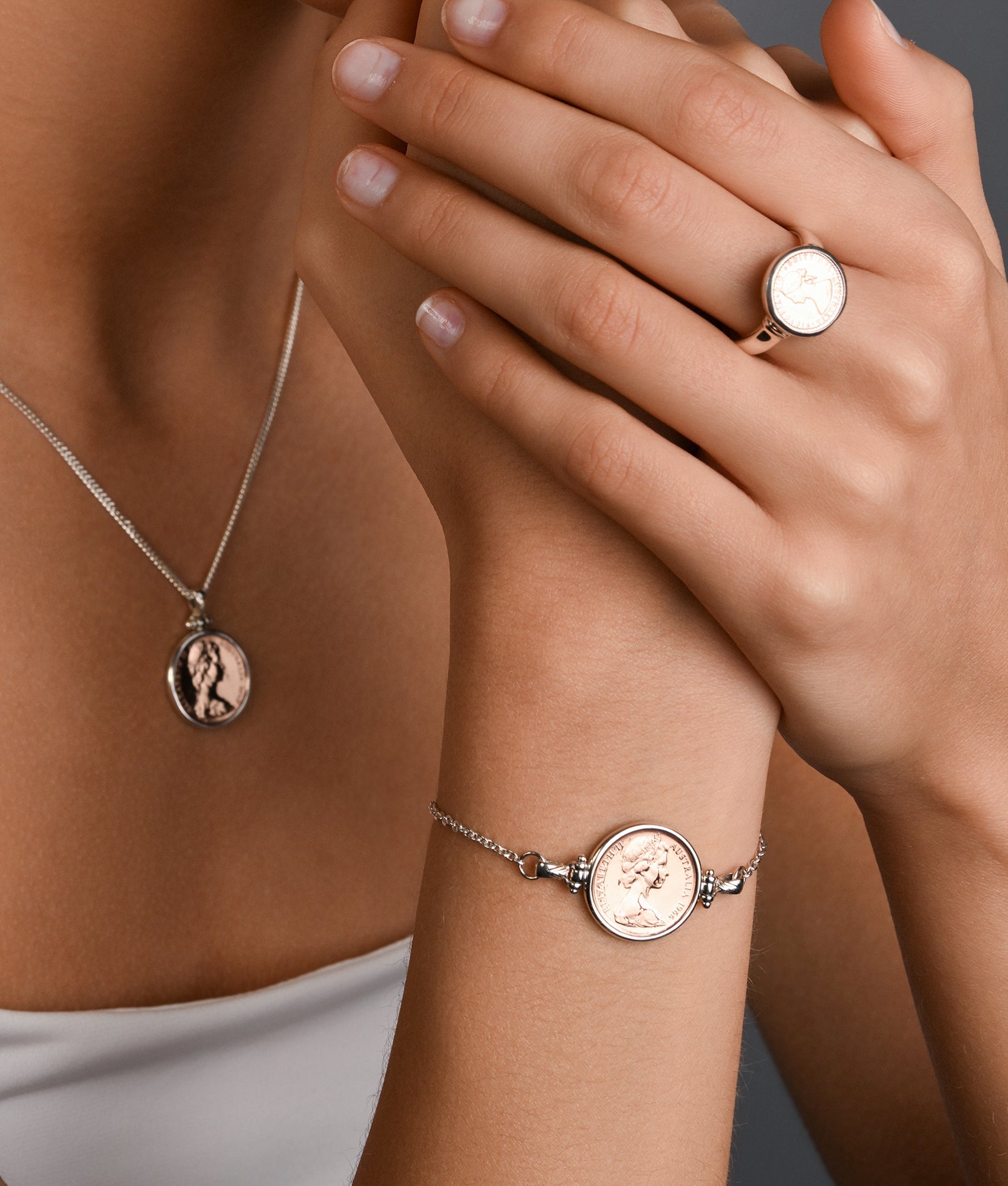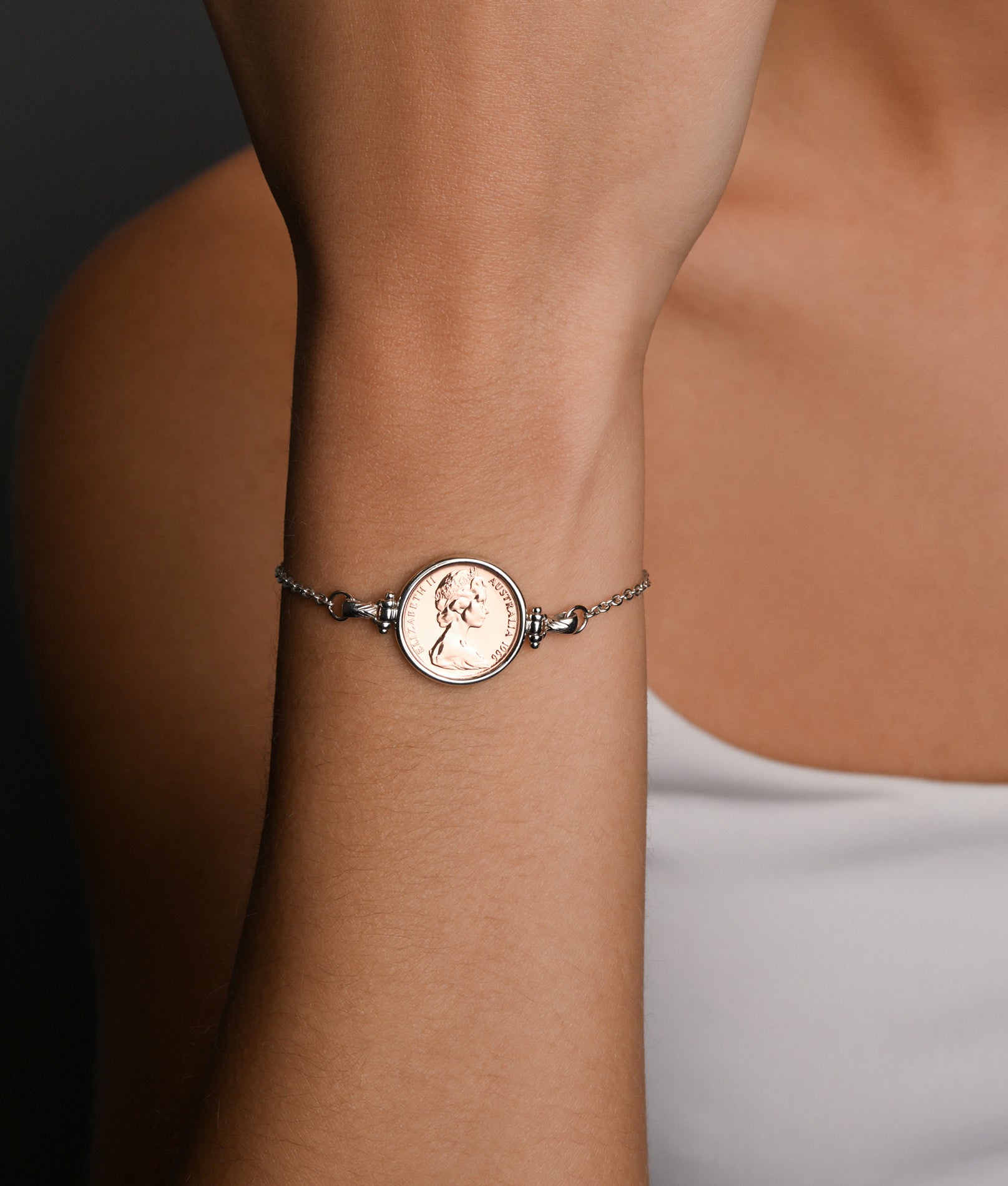 A classic with history. This fine belcher chain bracelet features an authentic Australian one cent coin, hinged for subtle movement and shine. A modern take on a timeless keepsake.