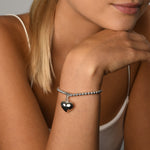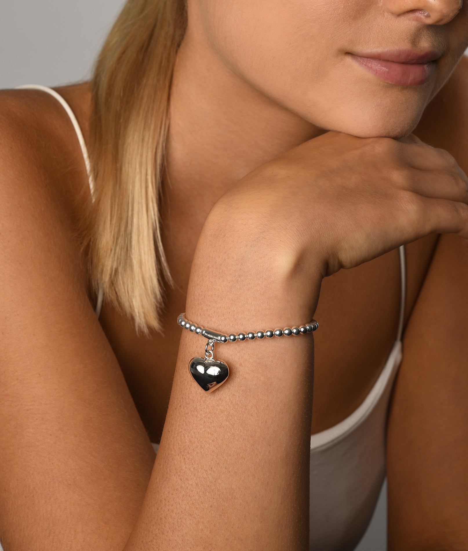Silver stretchy bracelet with puffy heart. Beads are threaded onto an elastic material, allowing the bracelet to stretch to fit a range of wrist sizes.