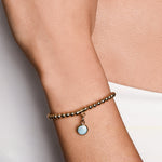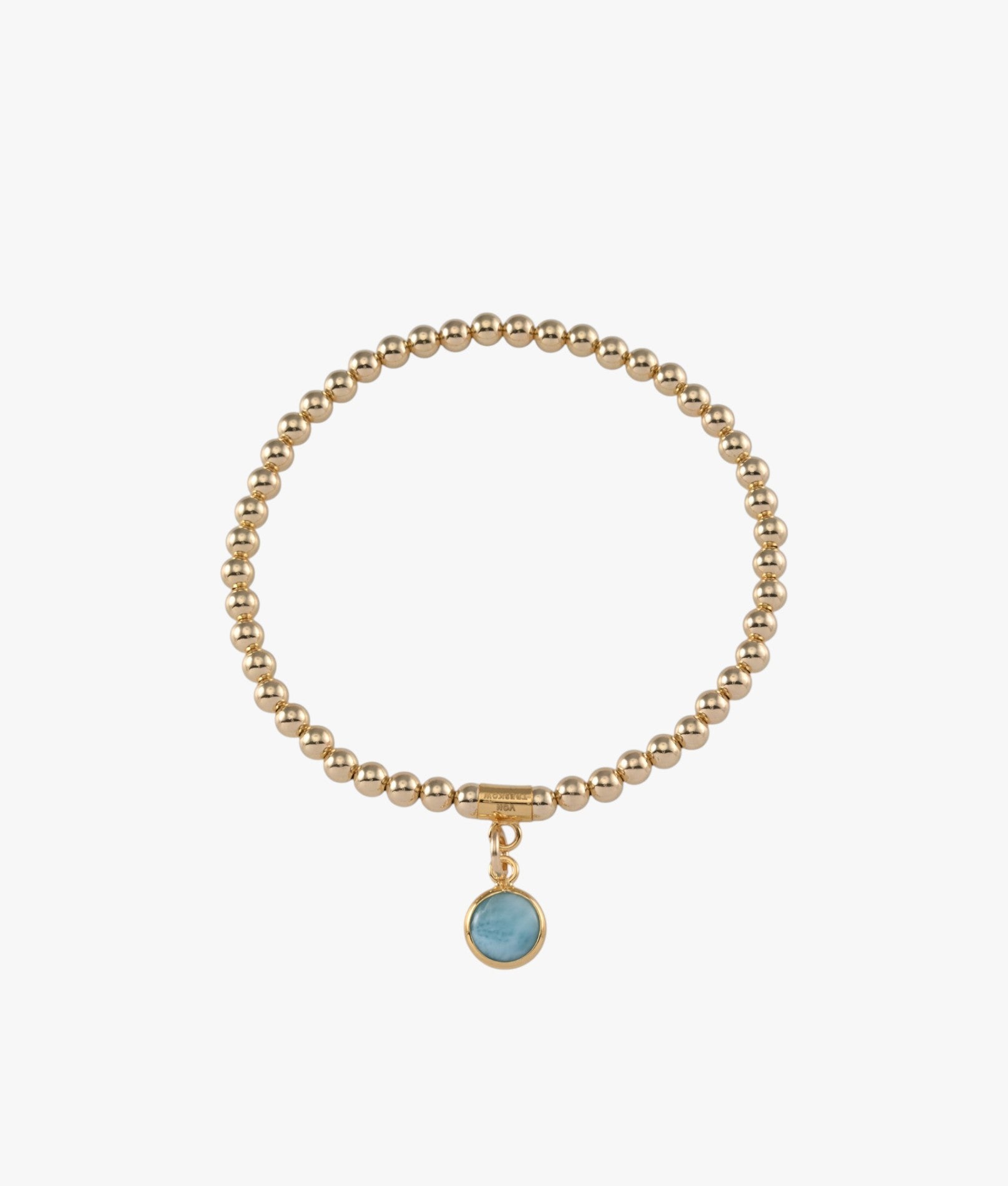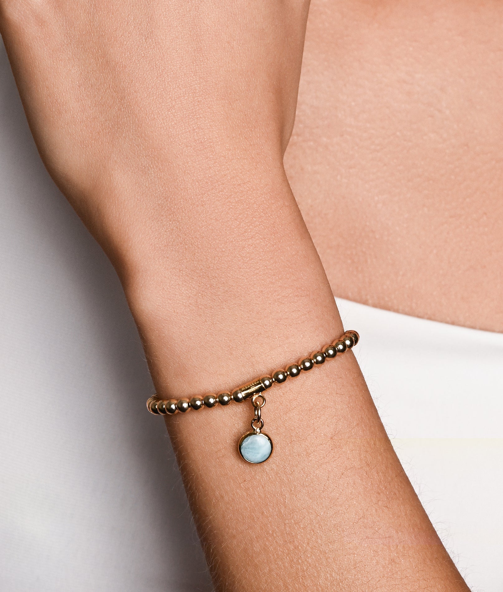 Calm colour, effortless form. This 4mm beaded bracelet features a small round Larimar charm - a rare gemstone found only in the Caribbean, formed in volcanic rock and prized for its ocean-blue hues. Designed with stretch for an easy, comfortable fit.