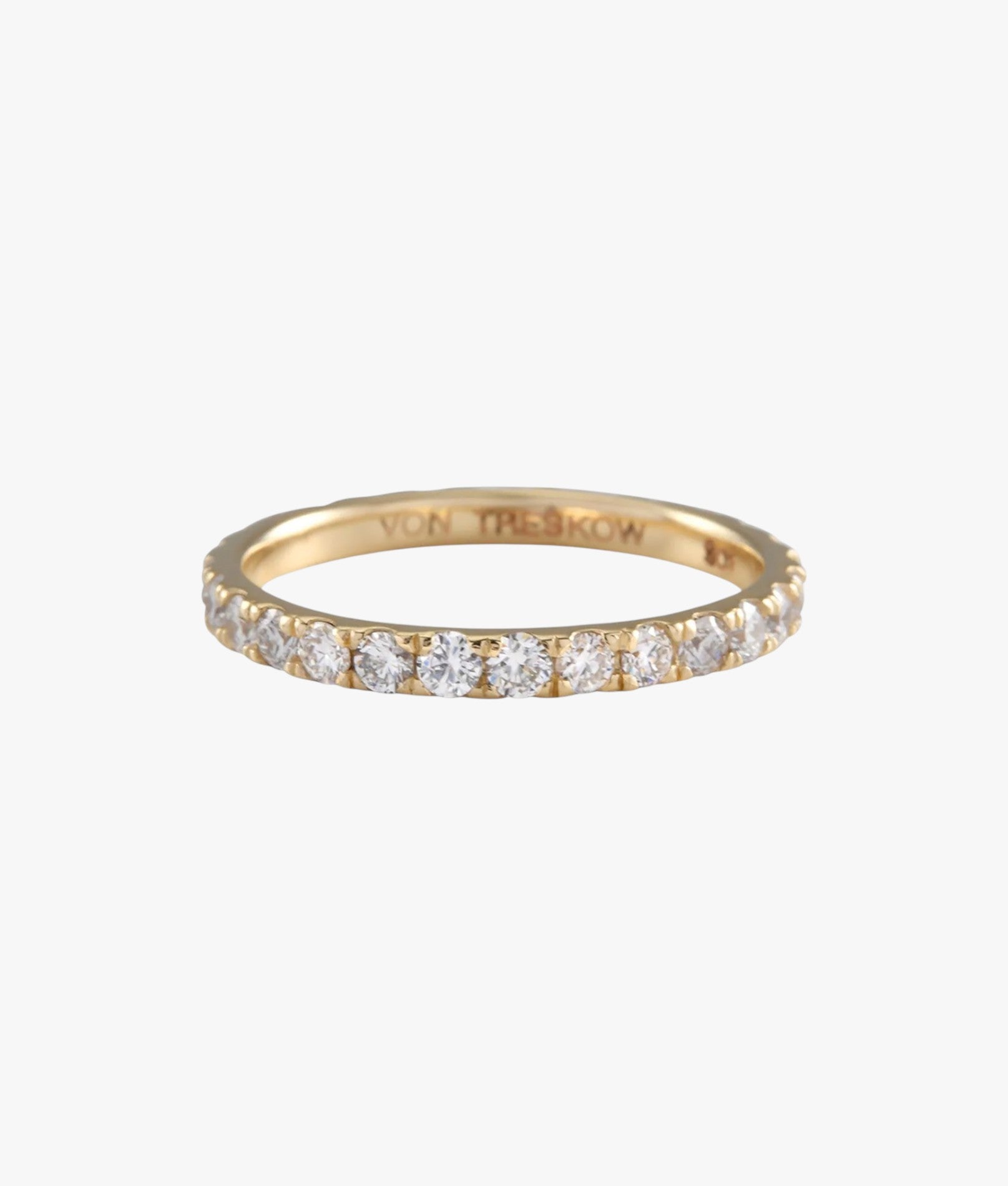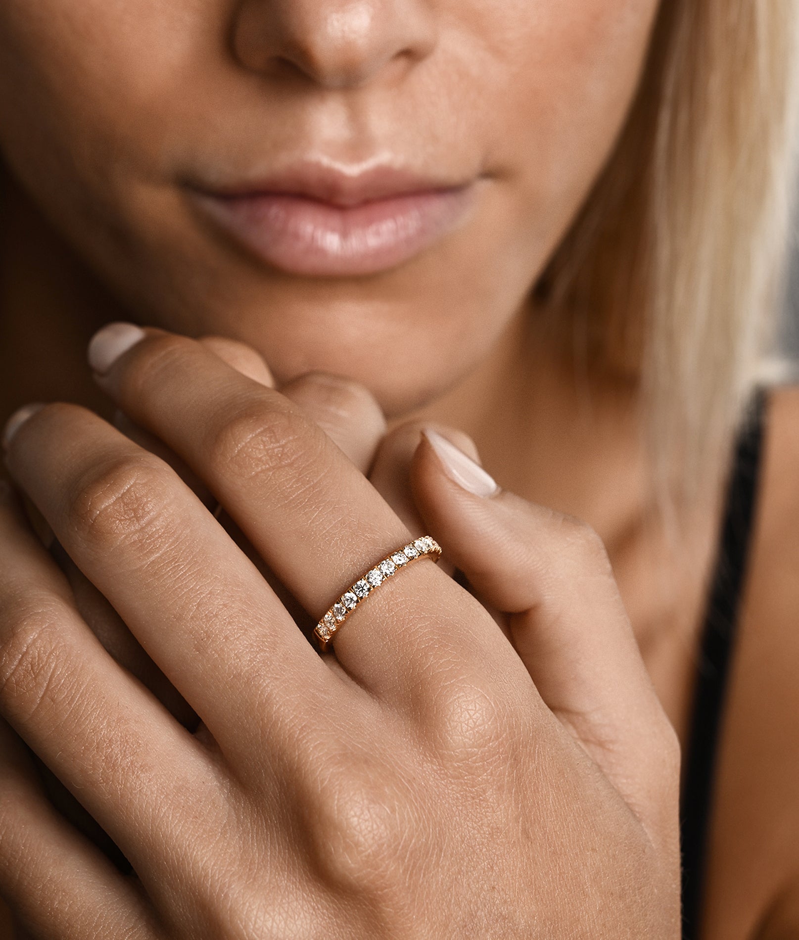 An unbroken circle of brilliance. This full-eternity ring features natural diamonds claw-set in 18ct yellow gold, creating a continuous band of light from every angle. Elegant alone, radiant stacked and a stunning choice for a wedding or anniversary band.