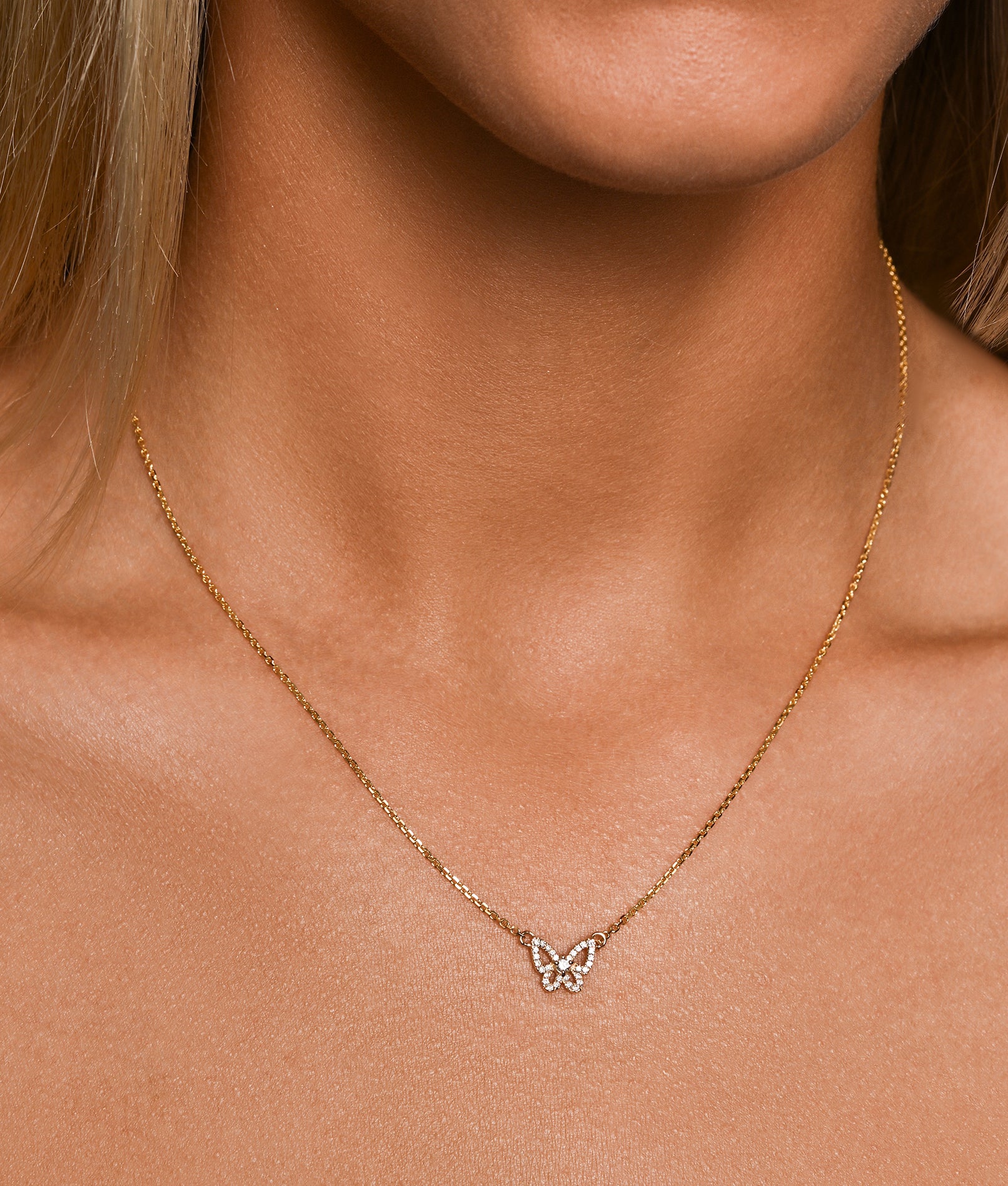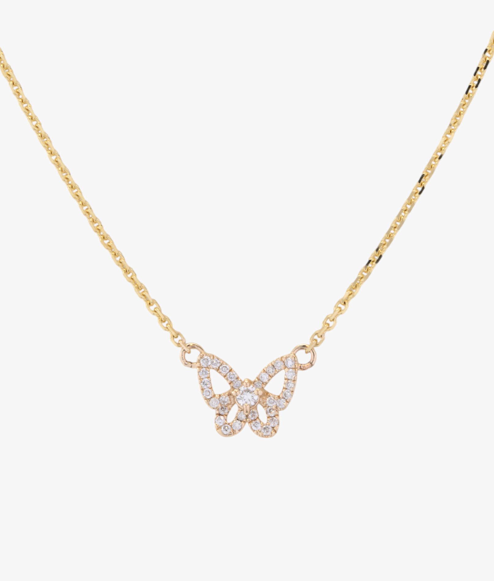 A timeless motif with a modern spirit. Suspended on a fine 14ct yellow gold chain, the Diamond Butterfly Necklace showcases a delicate butterfly set with sparkling diamonds. A versatile piece that brings softness and shimmer to every neckline.