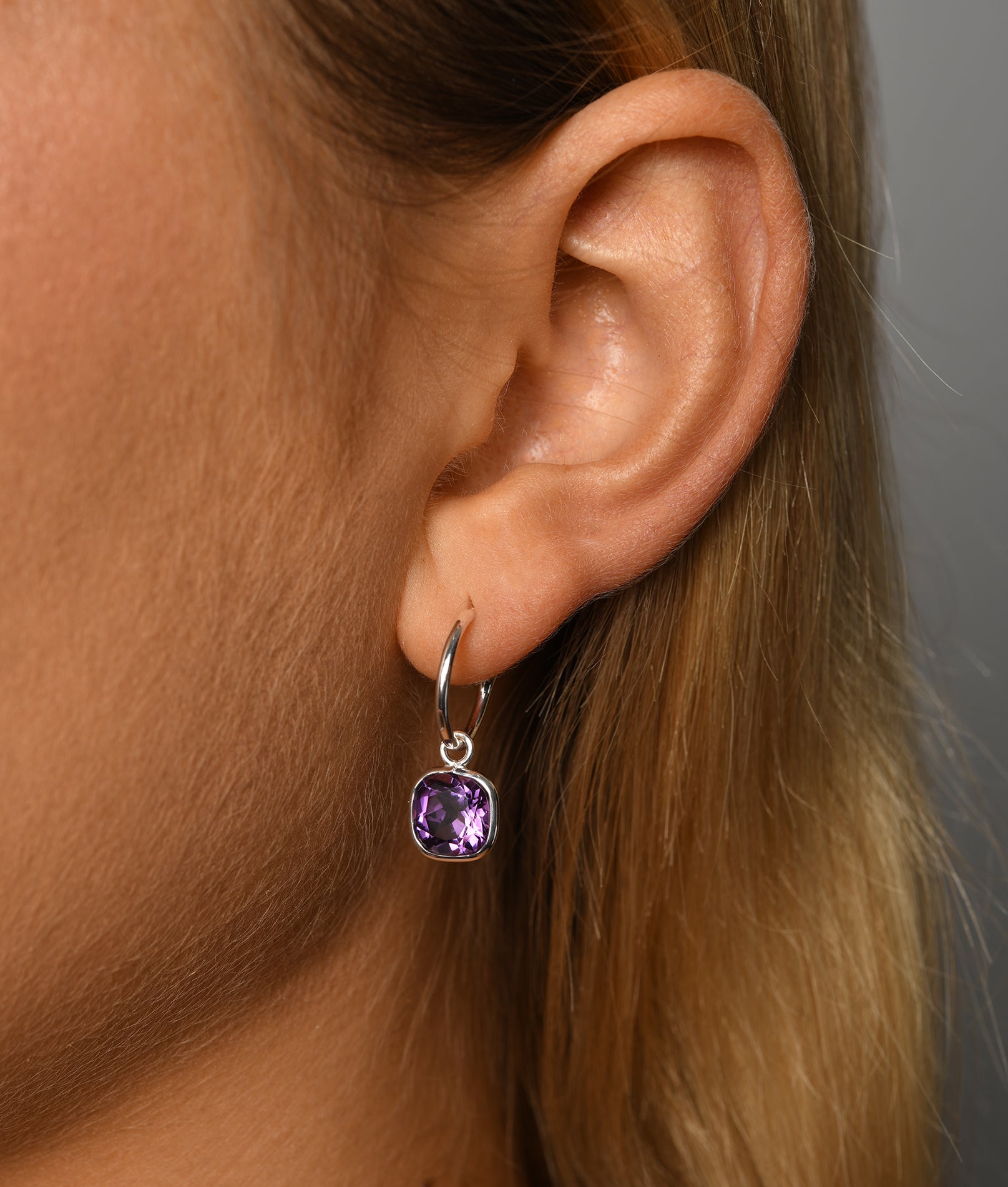Fine hoop studs with square amethyst