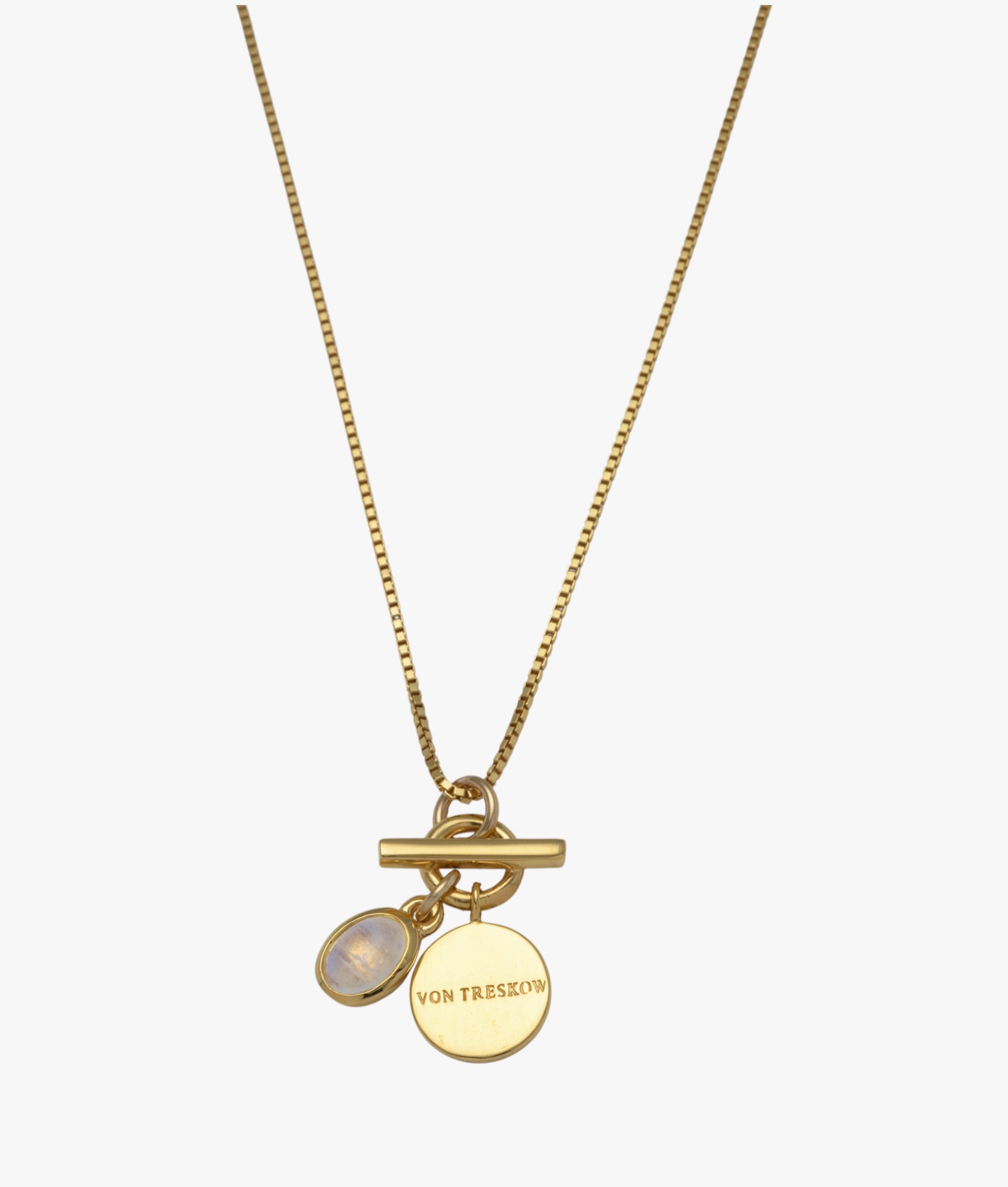 Fine box chain necklace with Von Treskow toggle and oval moonstone. Moonstone appears to glow internally through its silvery white-surface. The luminous bluish/purple hues change as you view from different angles. With a celestial feel, moonstone is said to be tied to the moon, providing a cylclical calmness & balance to your emotions & behaviours. Each Von Treskow moonstone is natural & formed by nature, featuring visible, unique inclusions inside each stone.