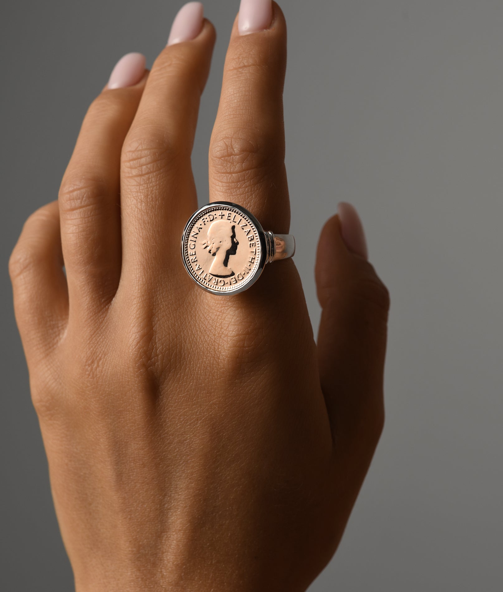 From Von Treskow's iconic coin collections, the authentic Australian threepence coin ring. This piece includes a real Australian threepence coin encased within rose gold and set into its band.