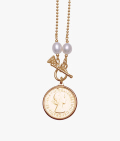 Stretchy ball & bar bracelet with freshwater pearl & authentic Australian threepence coin.