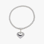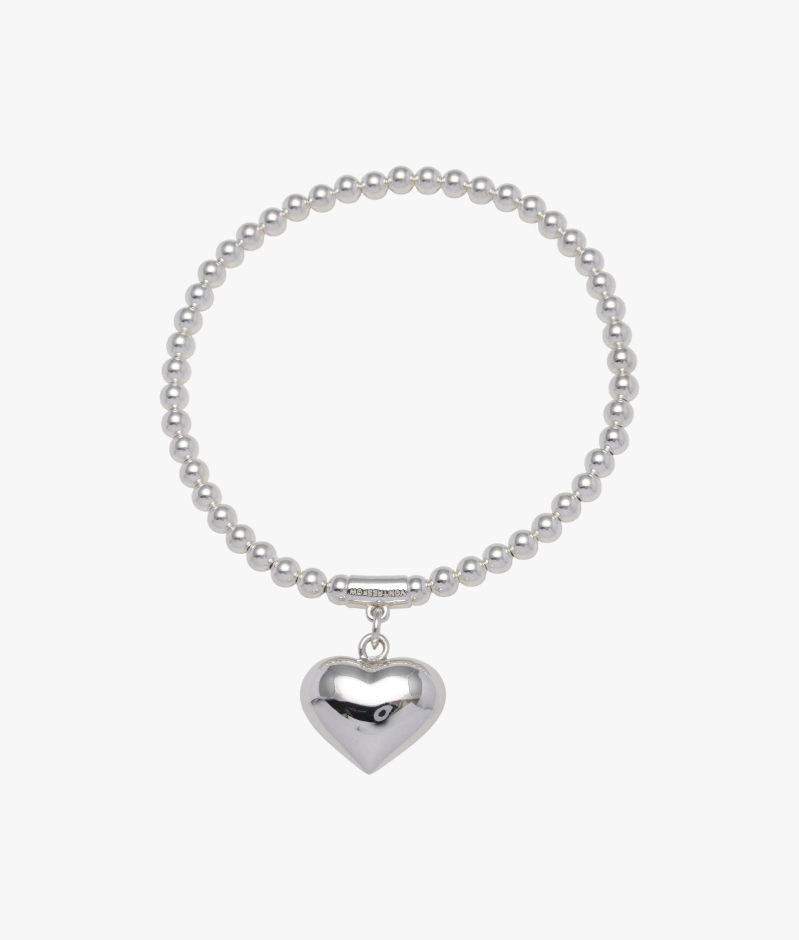 Silver stretchy bracelet with puffy heart. Beads are threaded onto an elastic material, allowing the bracelet to stretch to fit a range of wrist sizes.