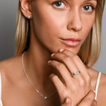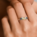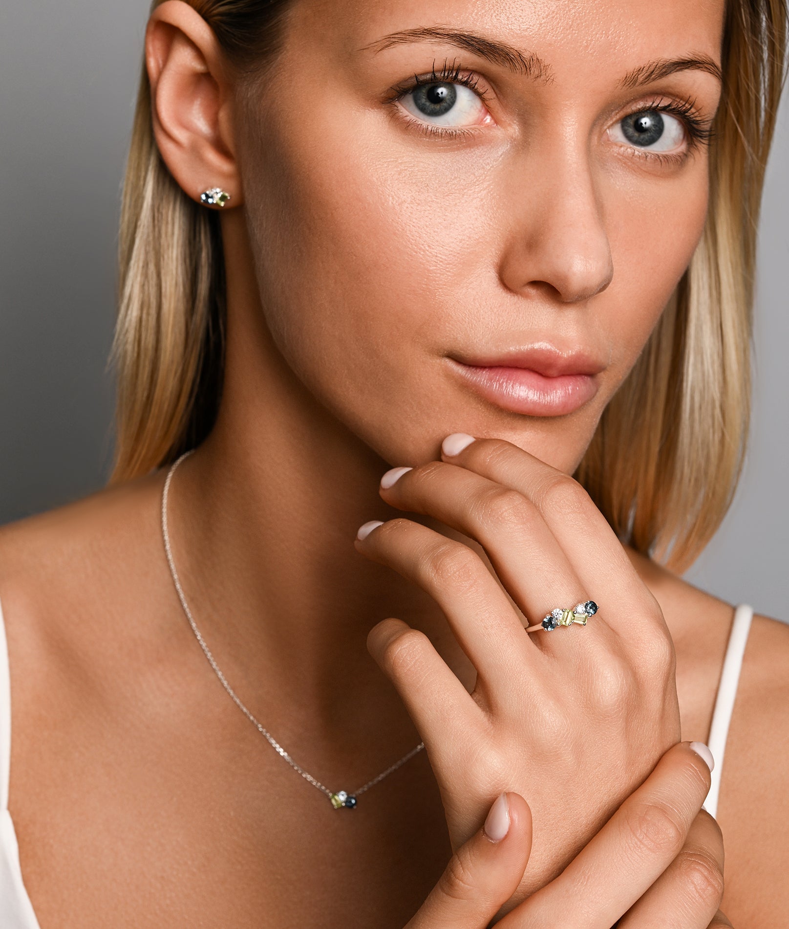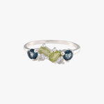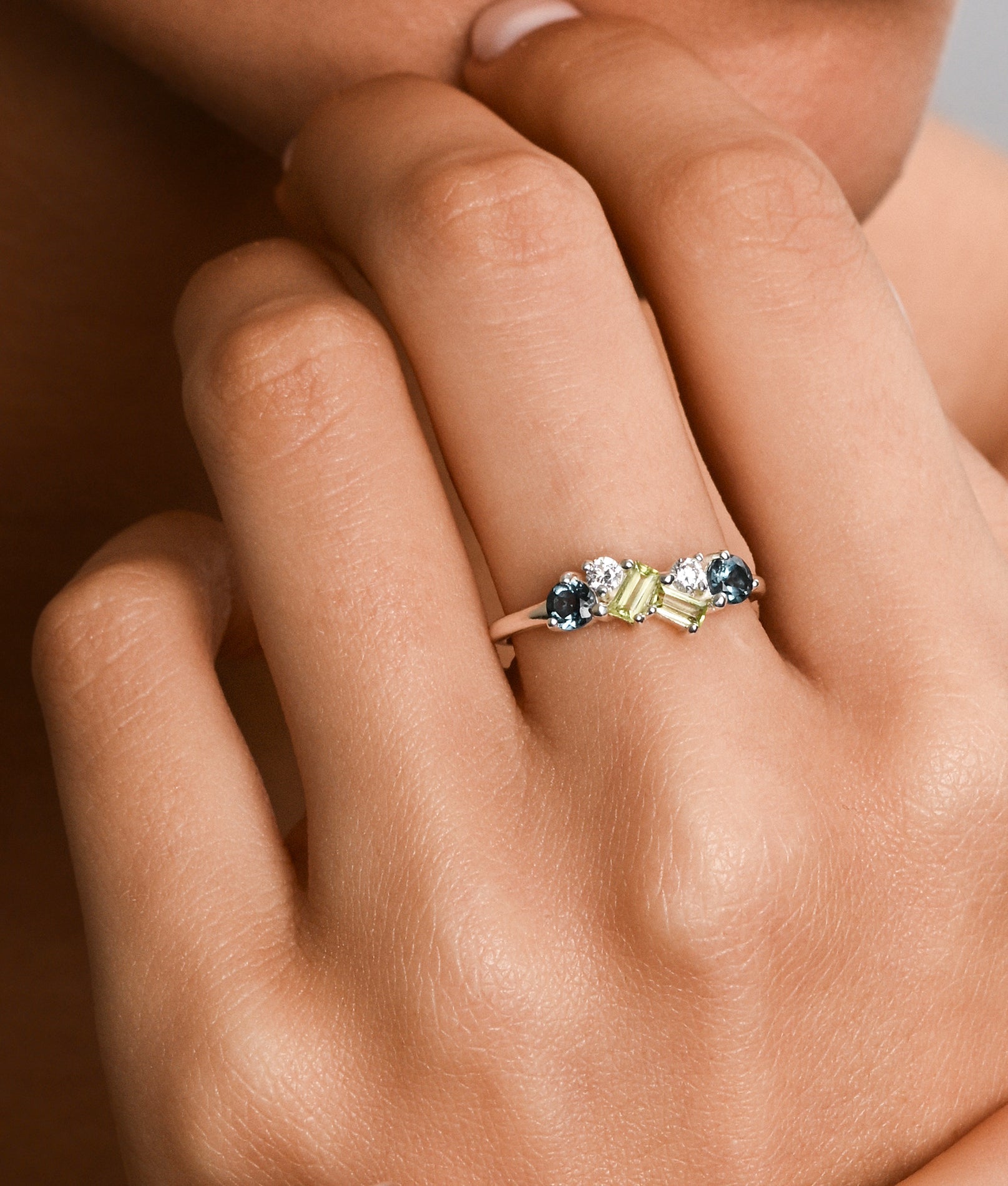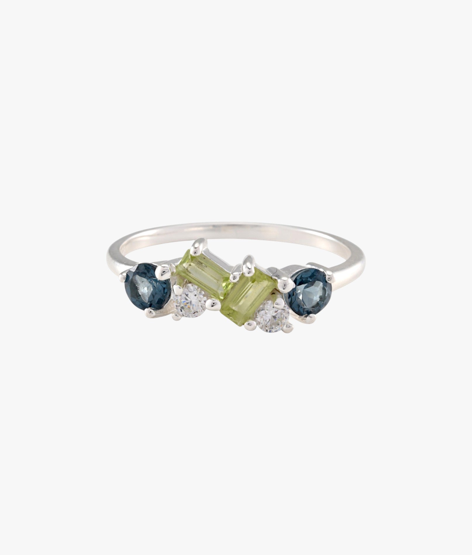 Colour in perfect balance. From Von Treskow’s Lime & Berry collection, this ring features two round London Blue Topaz stones, two baguette-cut Peridot, and a round accent of subtle sparkle. The mix of shapes and tones creates a fresh yet refined contrast, designed for effortless everyday wear.