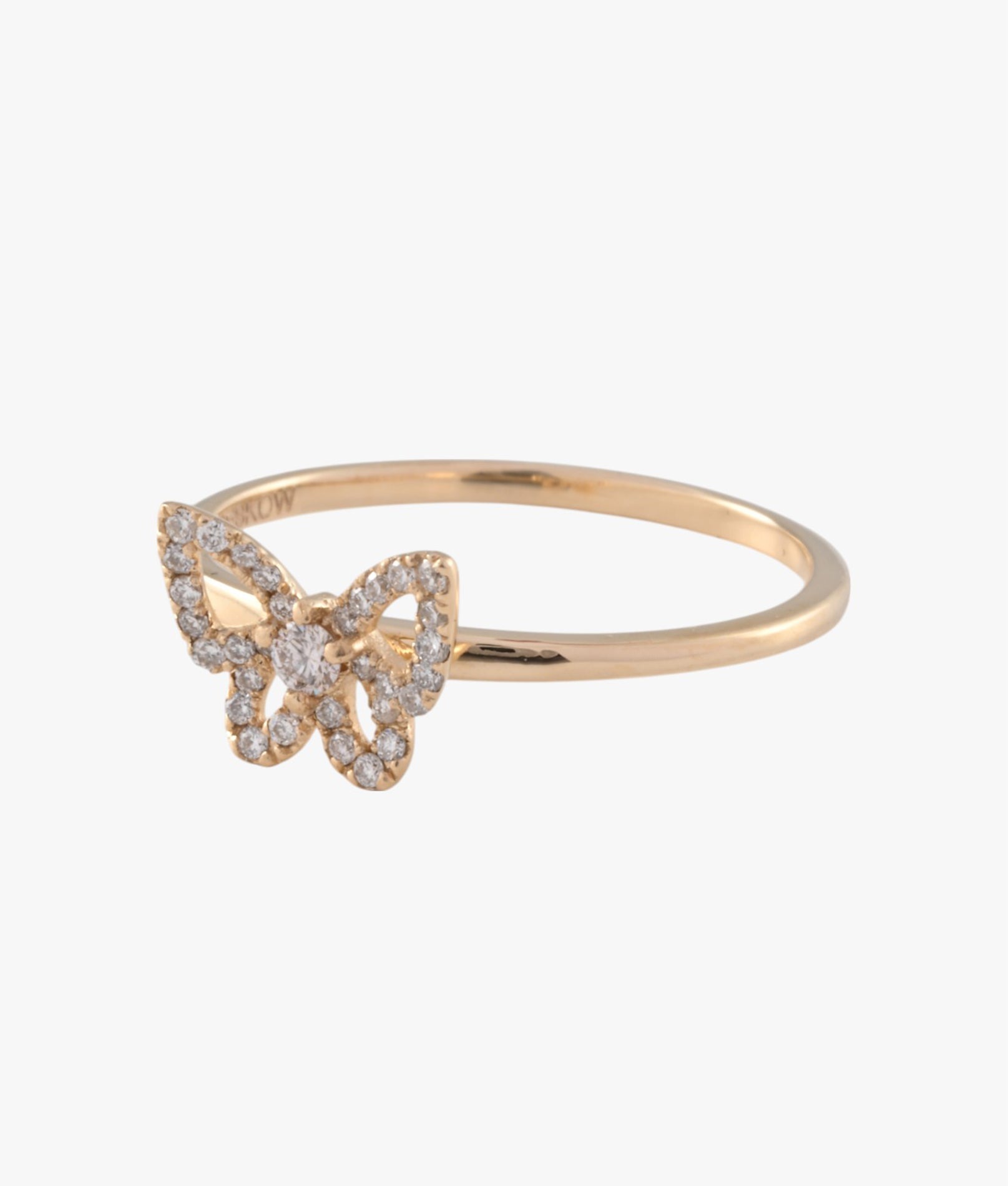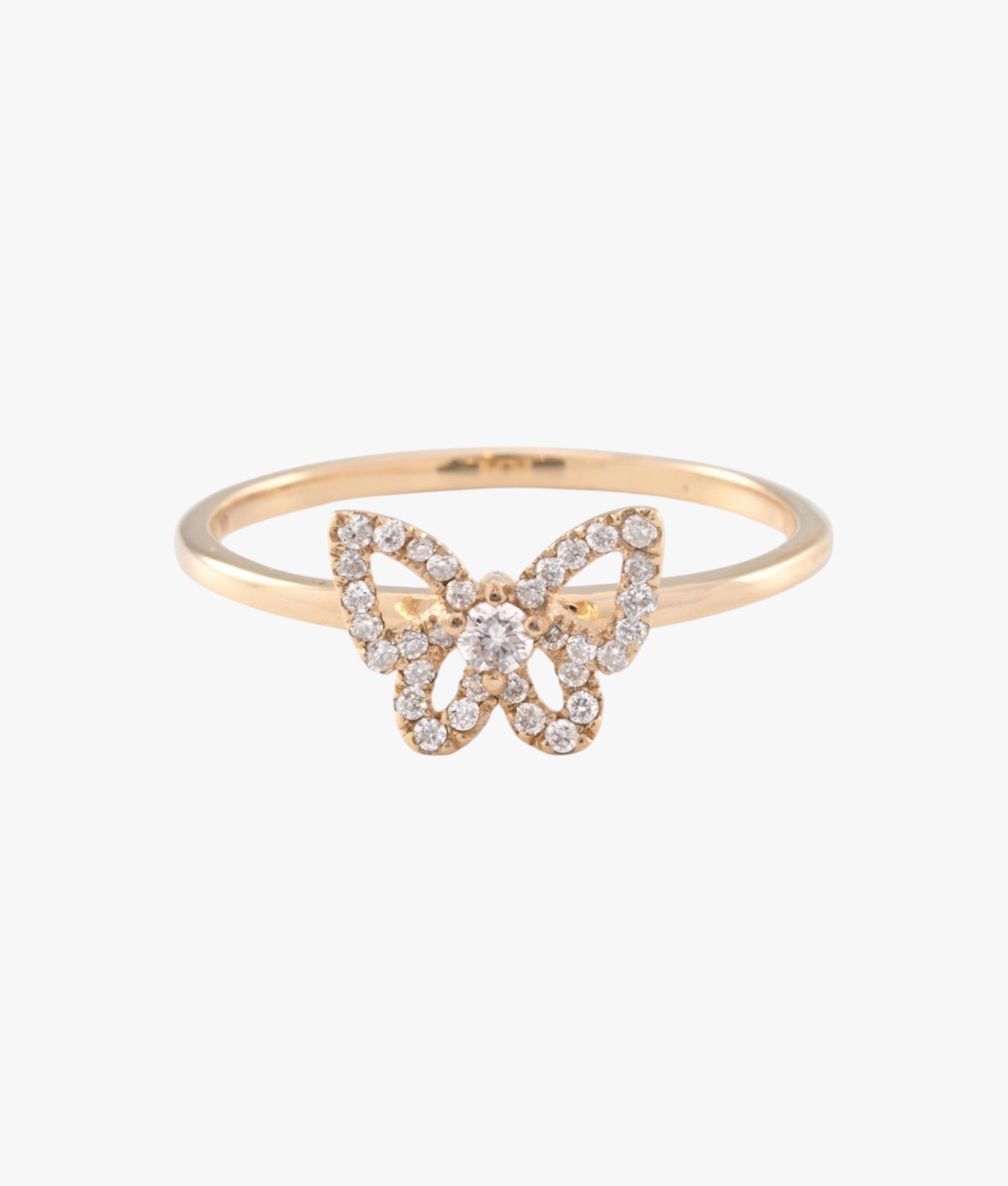 A touch of whimsy, reimagined in gold and diamonds. The Diamond Butterfly Ring features a pavé-set butterfly design that wraps the finger in brilliance. Subtle yet striking, it’s perfect worn alone or layered into your ring stack.