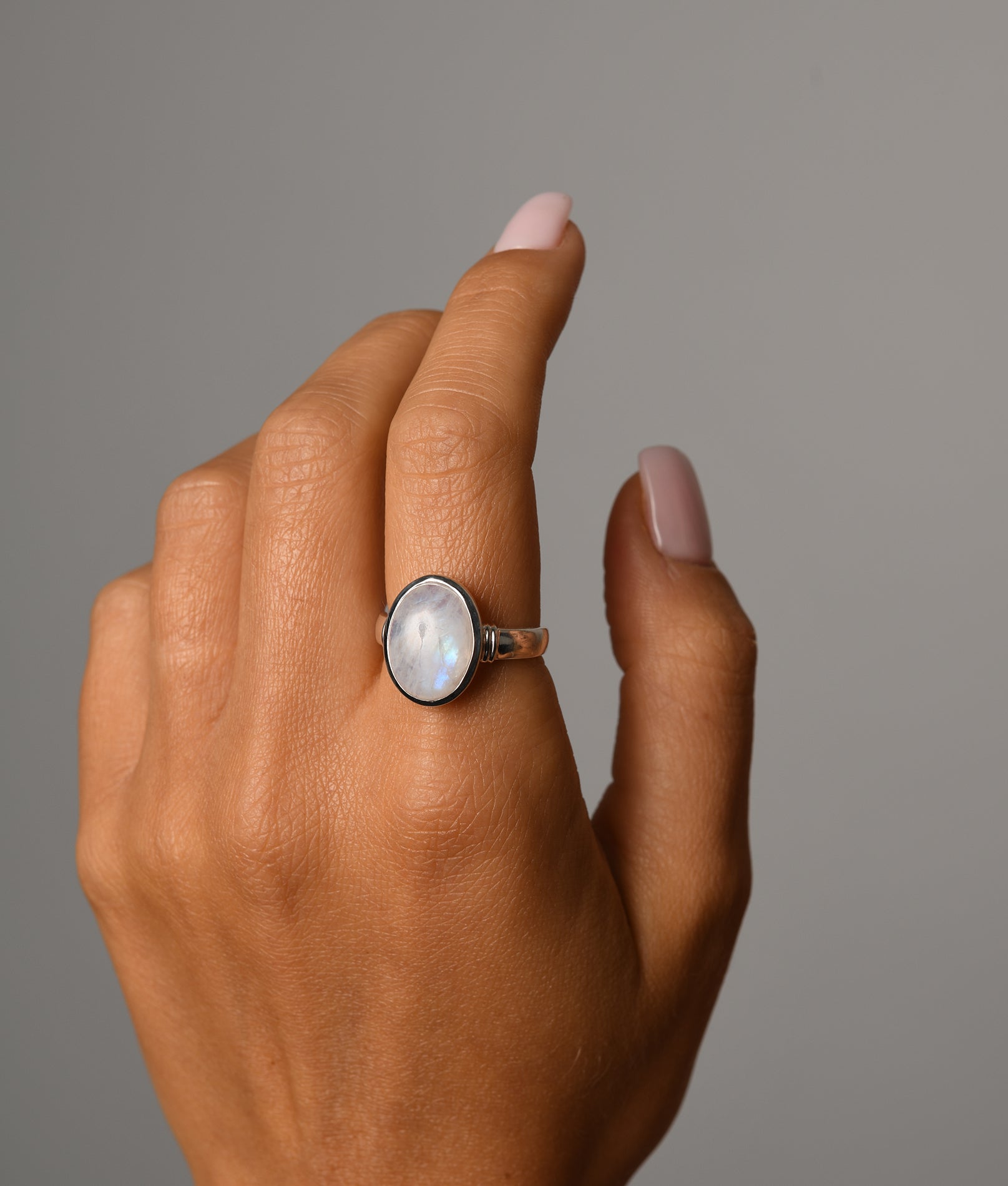 Large oval moonstone ring. Moonstone appears to glow internally through its silvery white-surface. The luminous bluish/purple hues change as you view from different angles. With a celestial feel, moonstone is said to be tied to the moon, providing a cylclical calmness & balance to your emotions & behaviours. Each Von Treskow moonstone is natural & formed by nature, featuring visible, unique inclusions inside each stone.