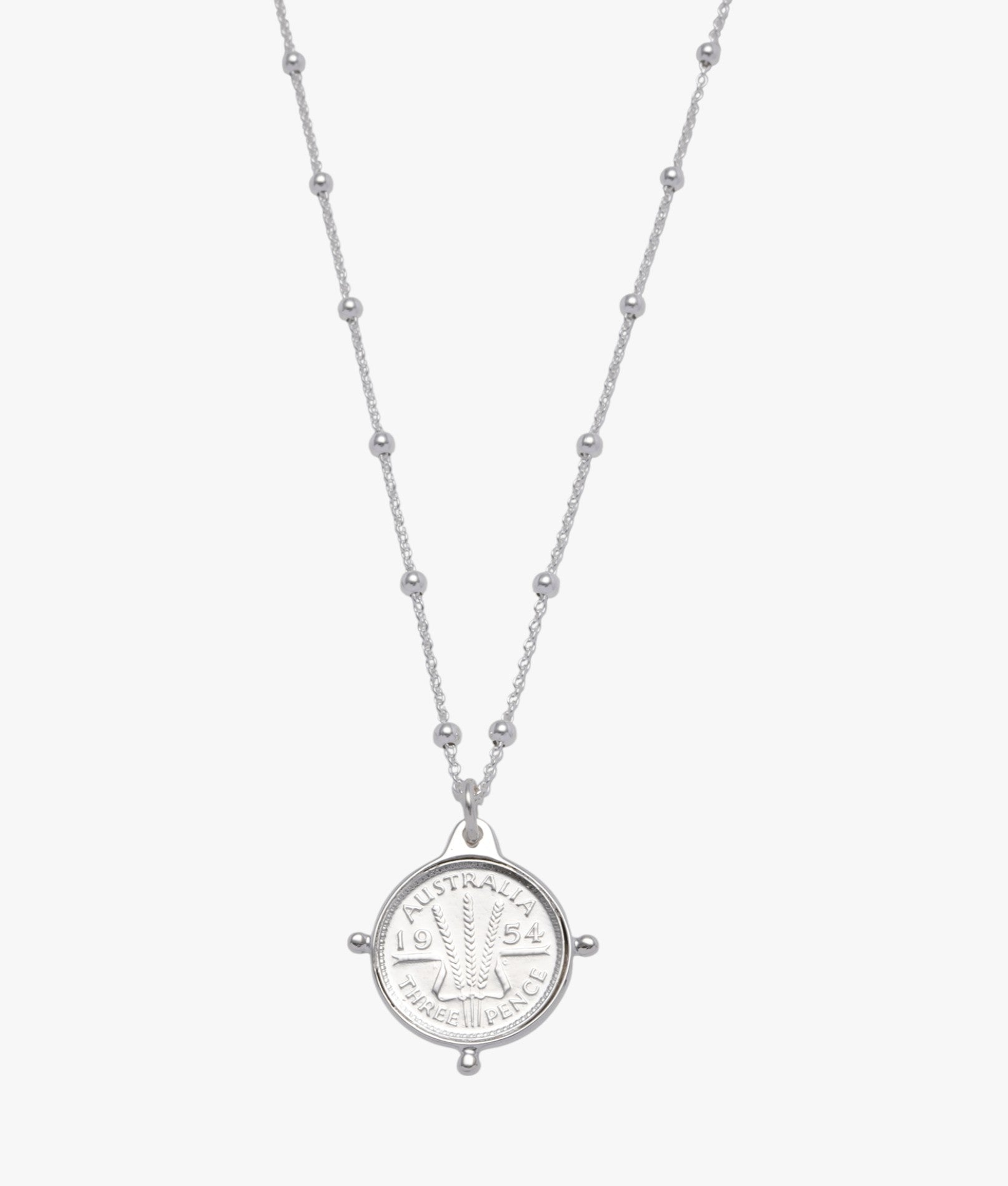 The Rosario chain is a rosary bead inspired chain. The beaded detail along its length brings more attention to this delicate necklace, which includes an authentic Australian threepence. The coin is encased in a sterling silver compass style frame.