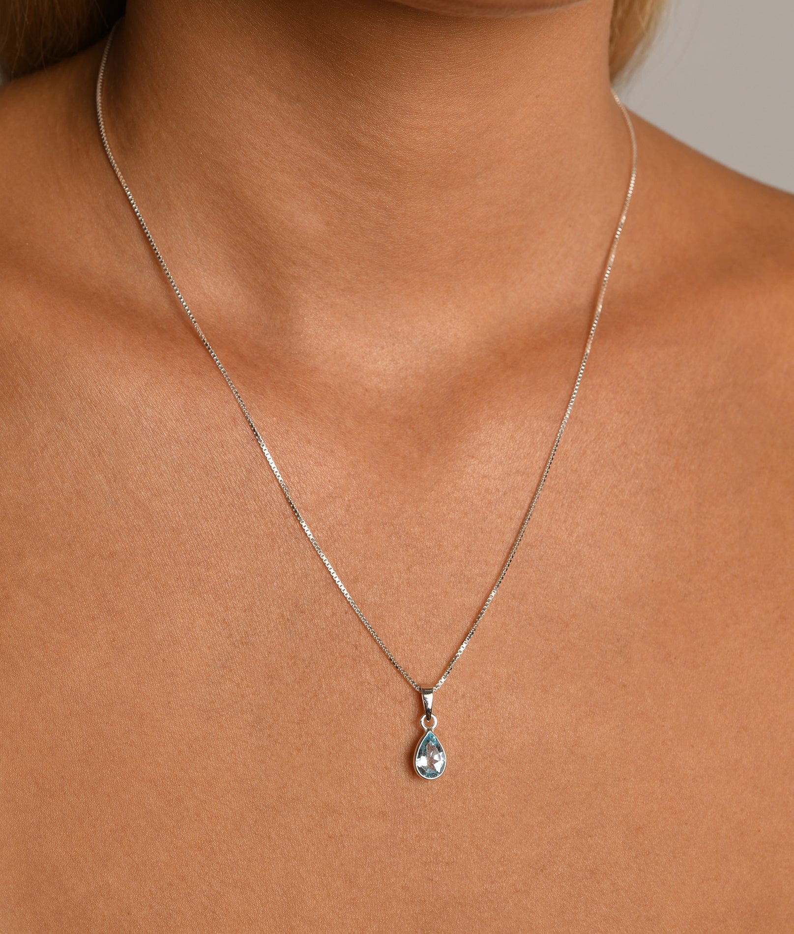 Fine box chain necklace with pear blue topaz
