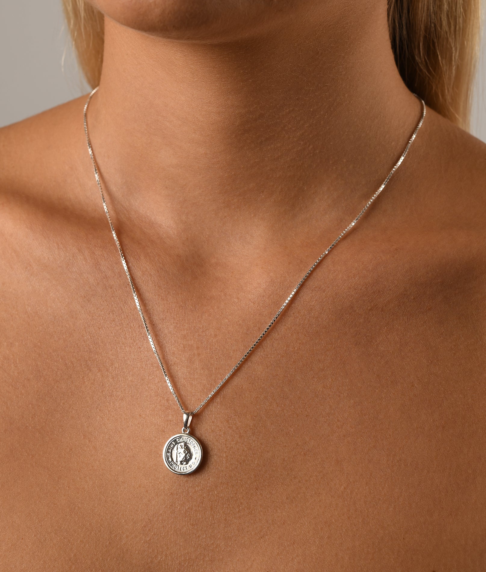 Fine box chain necklace with round St Christopher