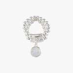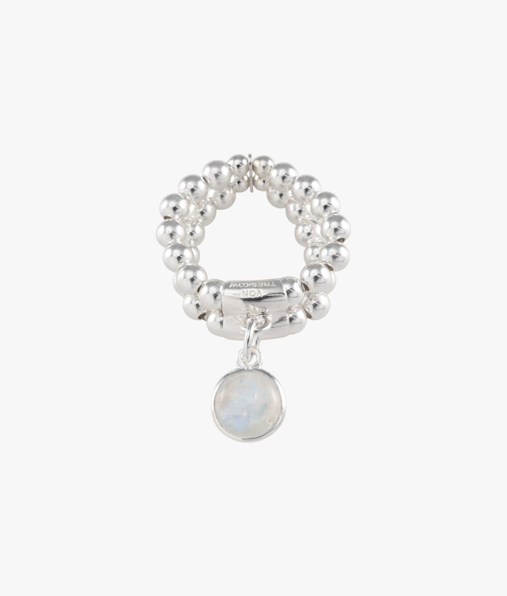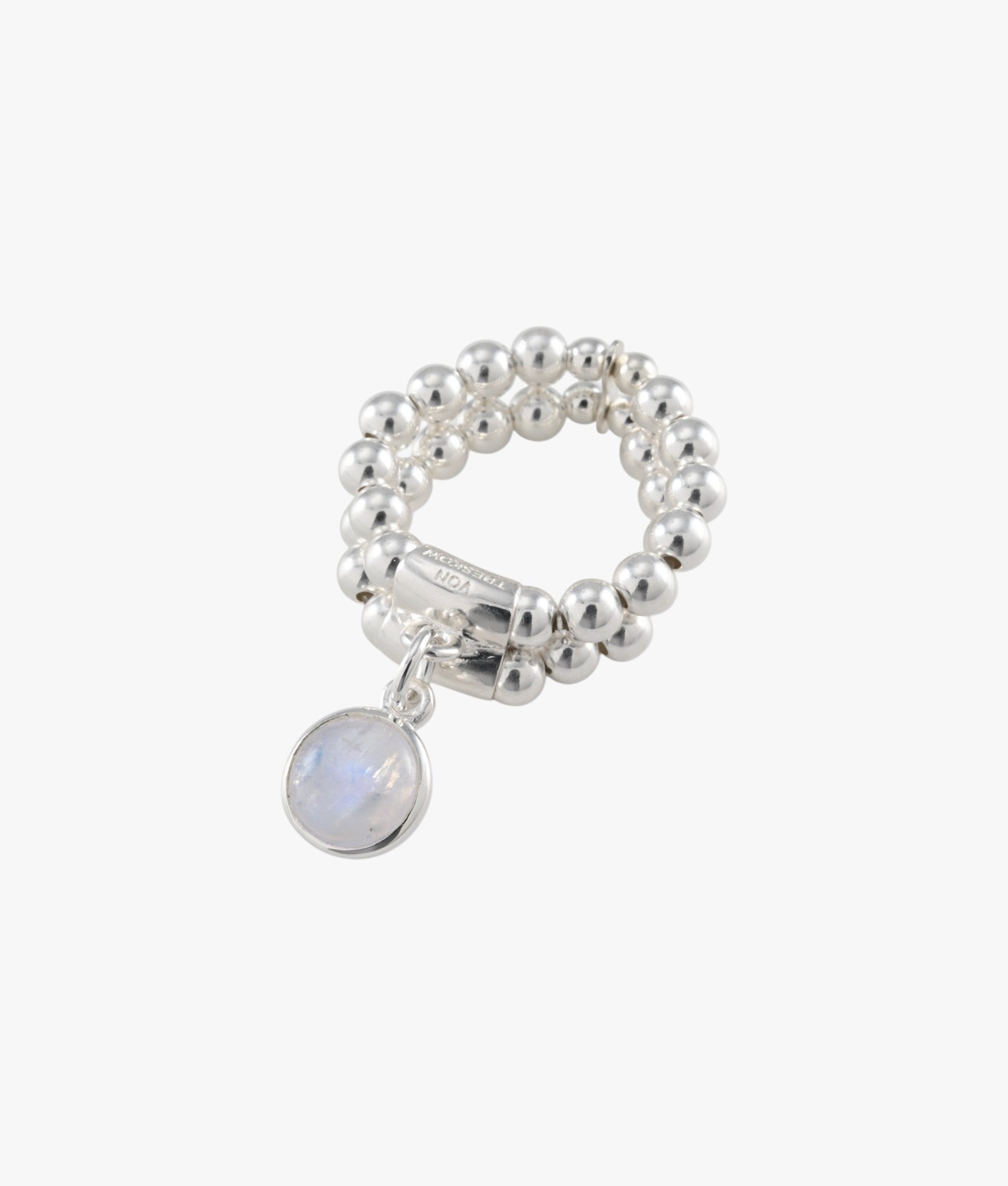 Double row stretchy ring with round moonstone. Moonstone appears to glow internally through its silvery white-surface. The luminous bluish/purple hues change as you view from different angles. With a celestial feel, moonstone is said to be tied to the moon, providing a cylclical calmness & balance to your emotions & behaviours. Each Von Treskow moonstone is natural & formed by nature, featuring visible, unique inclusions inside each stone.