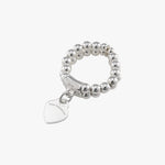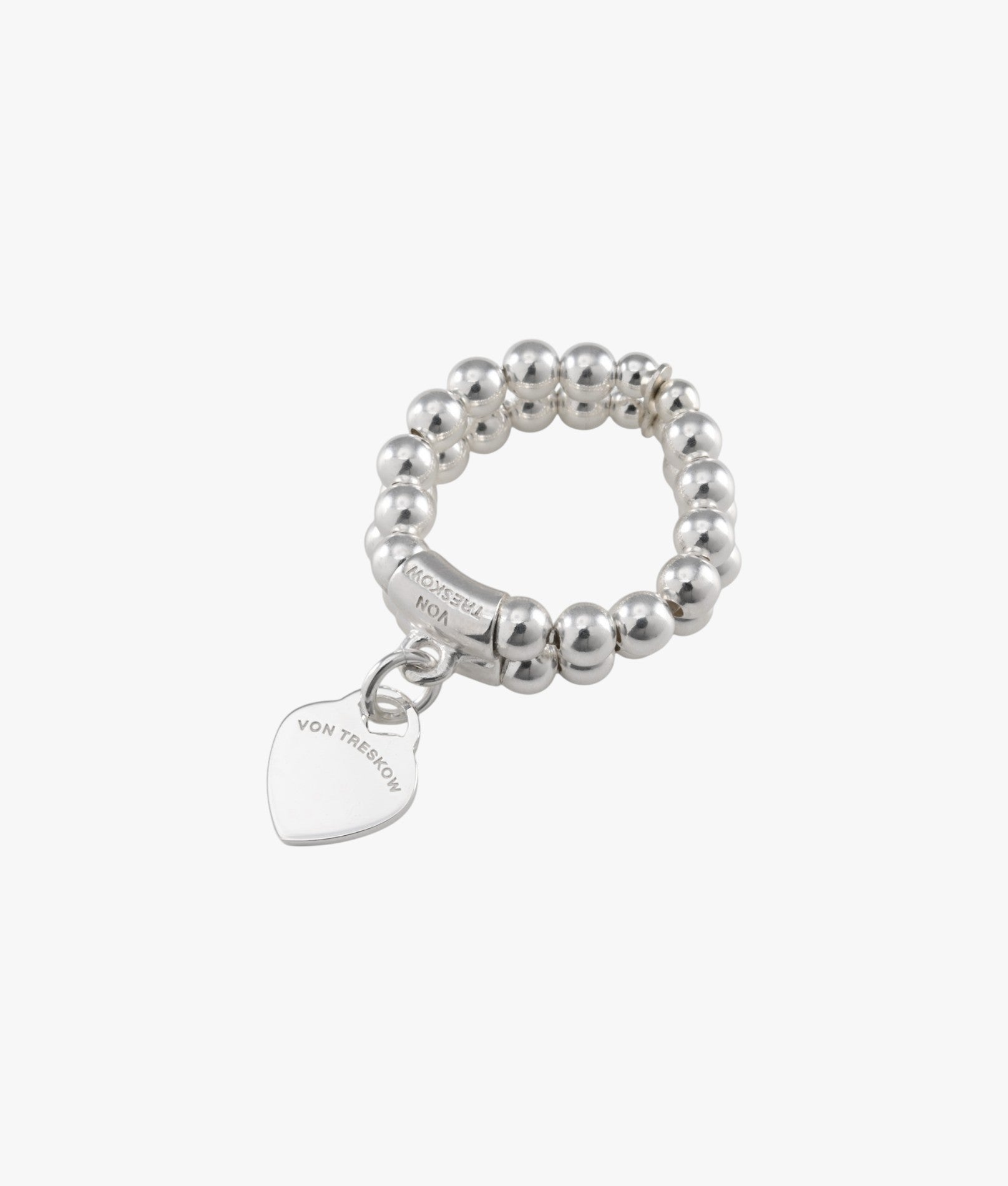 Two-strand stretchy ring with flat Von Treskow heart. The beads are threaded onto an elastic material, allowing the ring to stretch to fit a range of finger sizes.