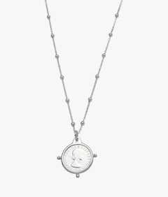 This piece features a real Australian threepence coin encased within a sterling silver 'compass frame', with detail pointing to North, South, East & West. Beads are threaded onto an elastic material, allowing the bracelet to stretch to fit a range of wrist sizes.