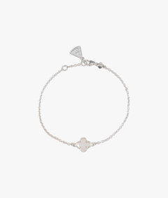 An adjustable ball chain necklace featuring a radiant mother of pearl clover.