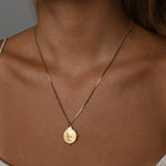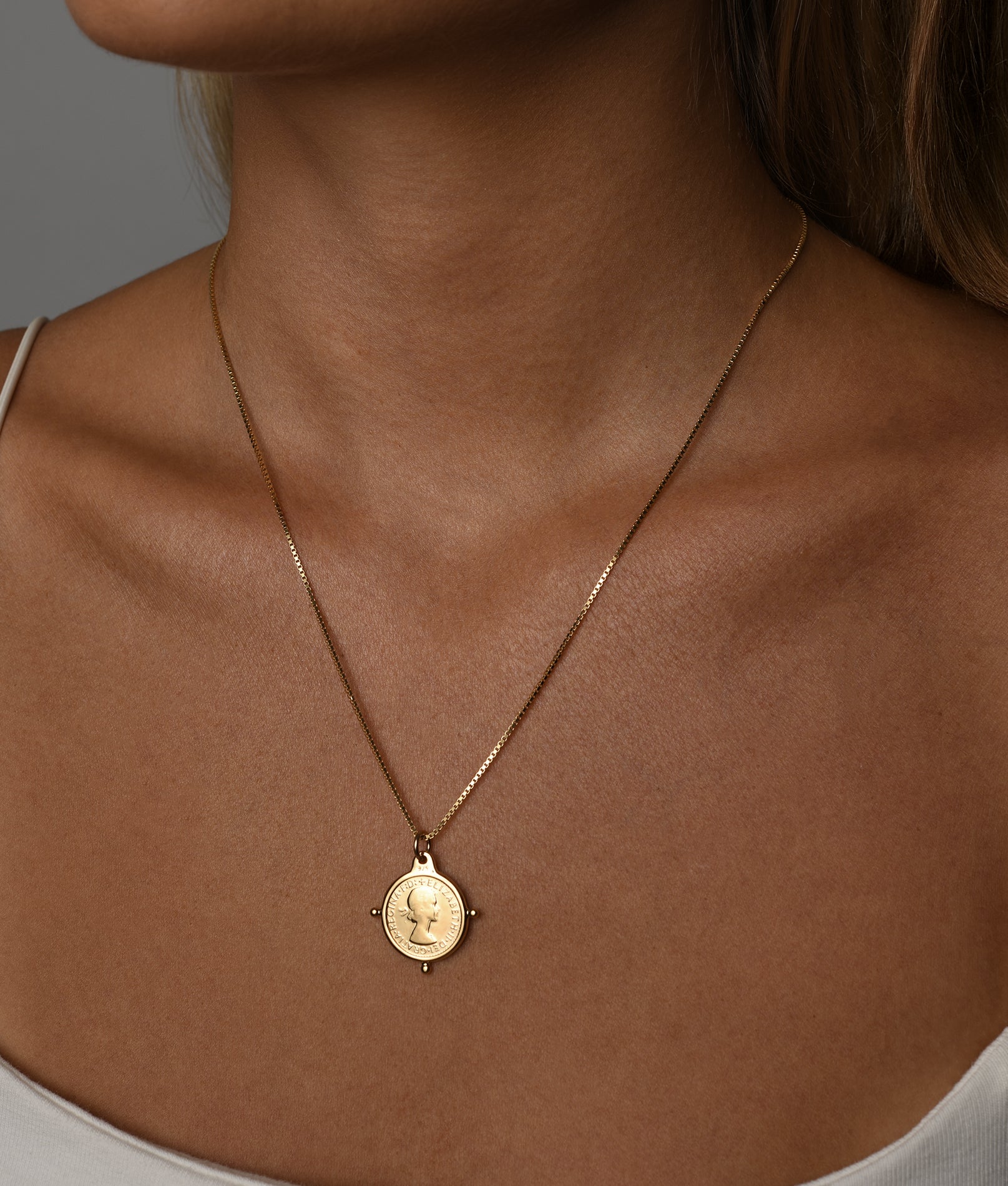 Fine box chain necklace with authentic Australian threepence coin in 'compass frame'. The compass frame includes detail at North, South, East & West.