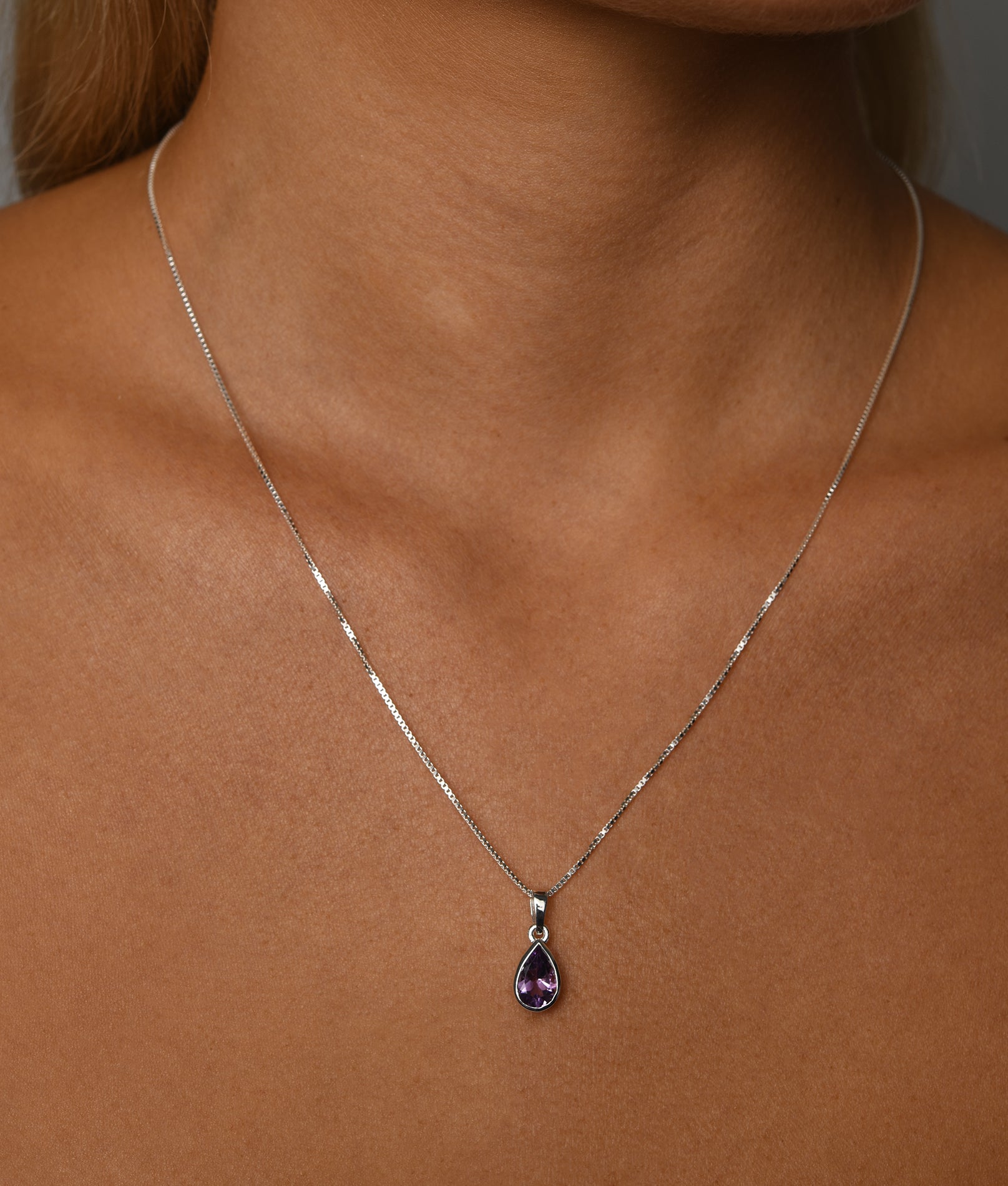 Extra fine box chain necklace with pear shaped natural amethyst.