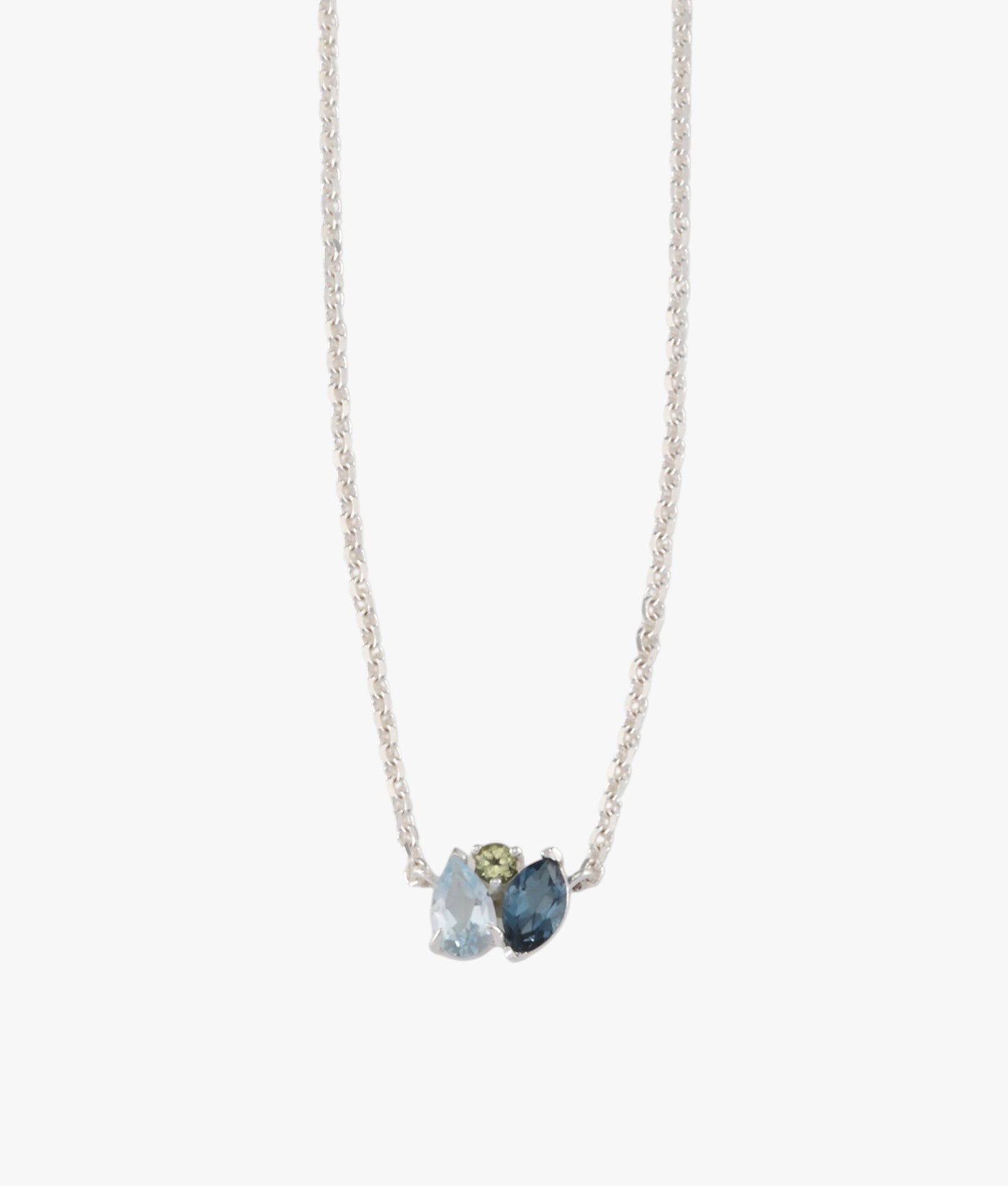 A play of shape and colour. From Von Treskow’s Lime & Berry collection, this fine chain necklace features a marquise-cut London Blue Topaz, round Peridot, and pear-cut Sky Blue Topaz. Together, the trio of stones creates a balanced mix of deep blue, vibrant green, and soft sky tones - a refined statement for everyday layering.