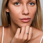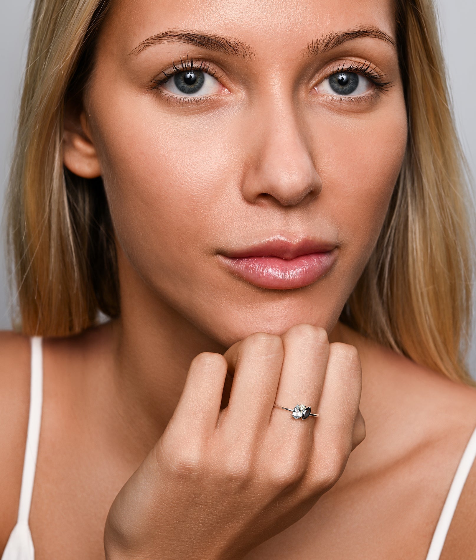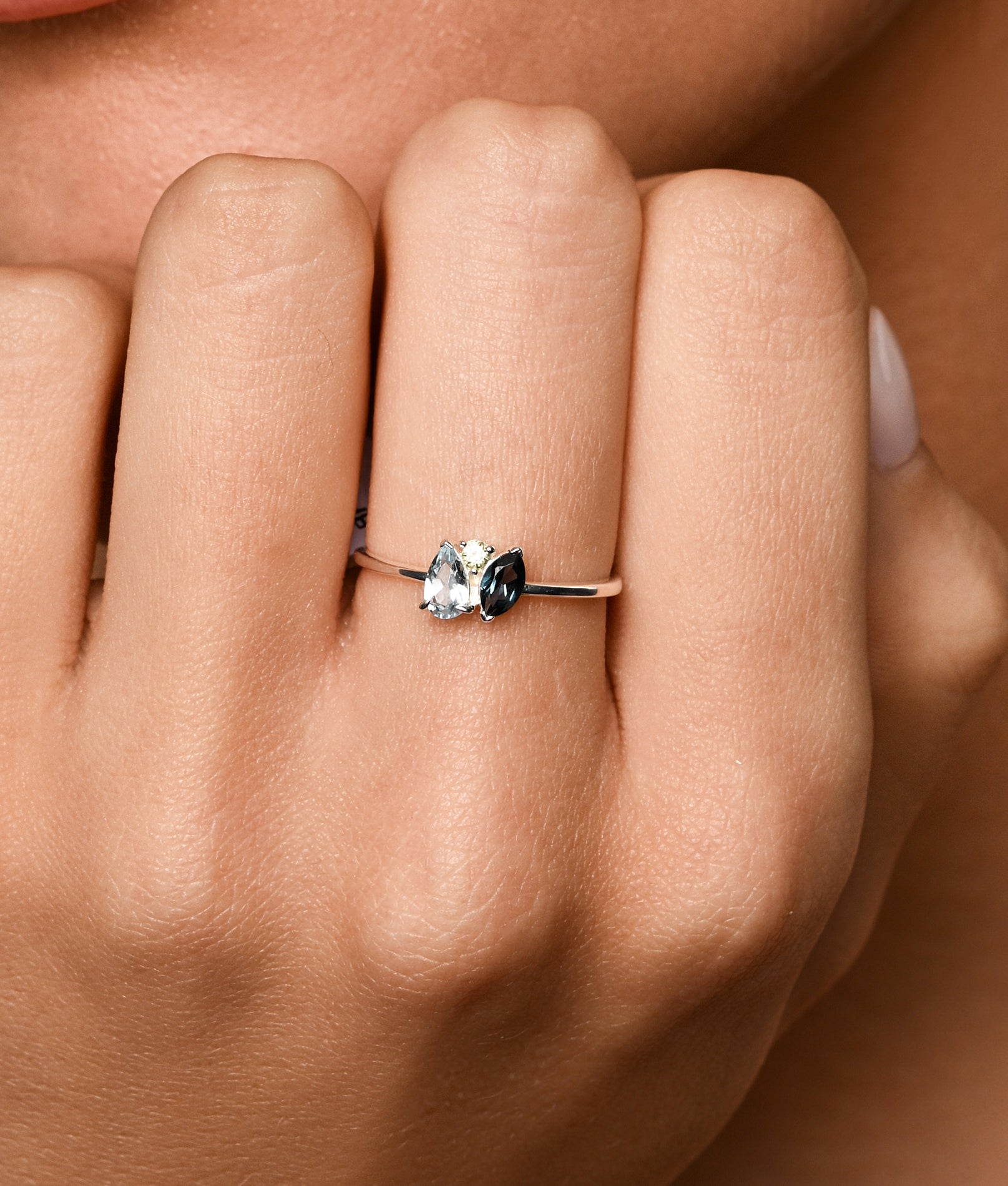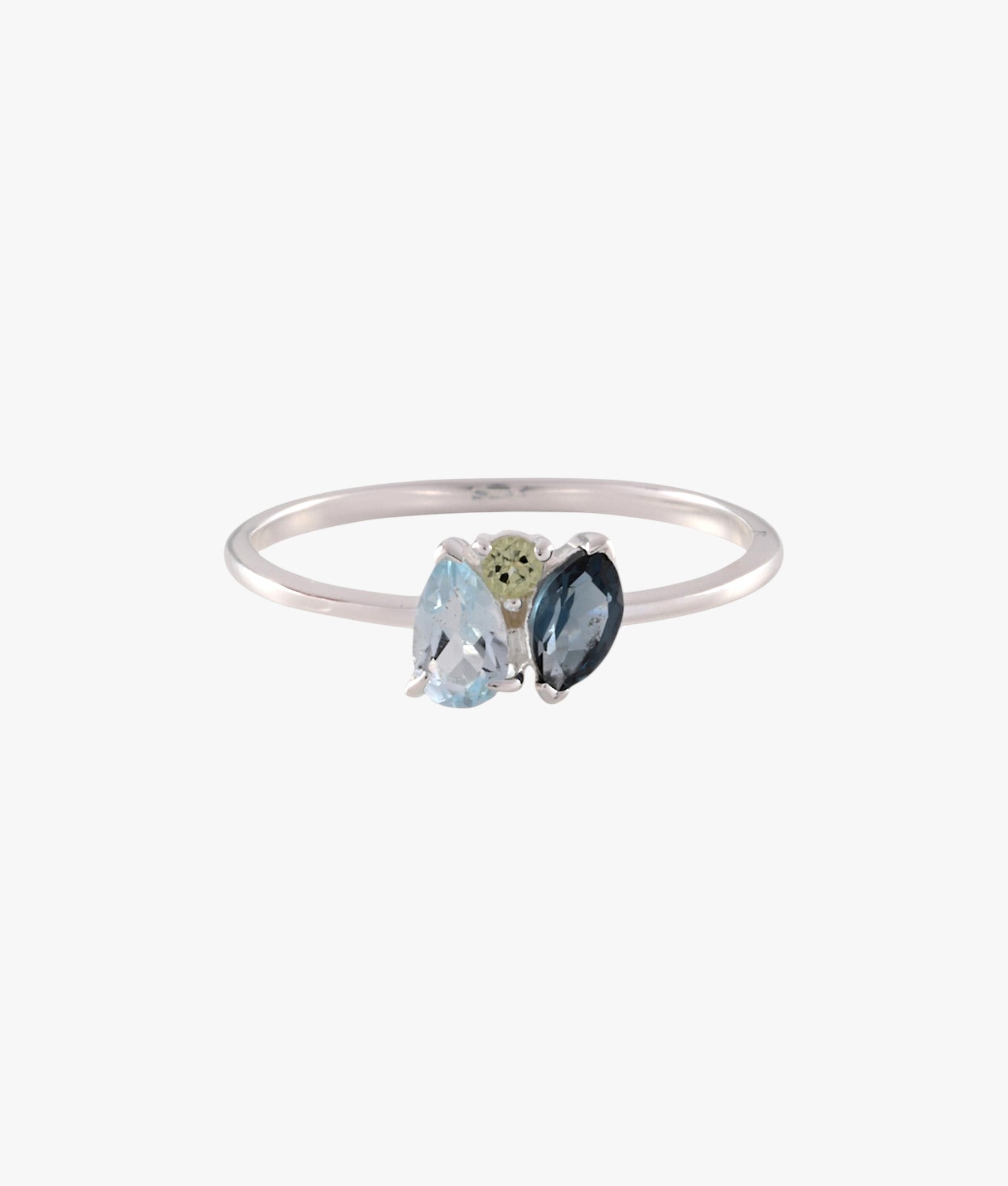 Shape and colour, perfectly paired. From Von Treskow’s Lime & Berry collection, this sterling silver ring features a marquise-cut London Blue Topaz, round Peridot, and pear-cut Sky Blue Topaz. The mix of forms and tones adds a refined yet vibrant finish - a modern expression of colour in motion.