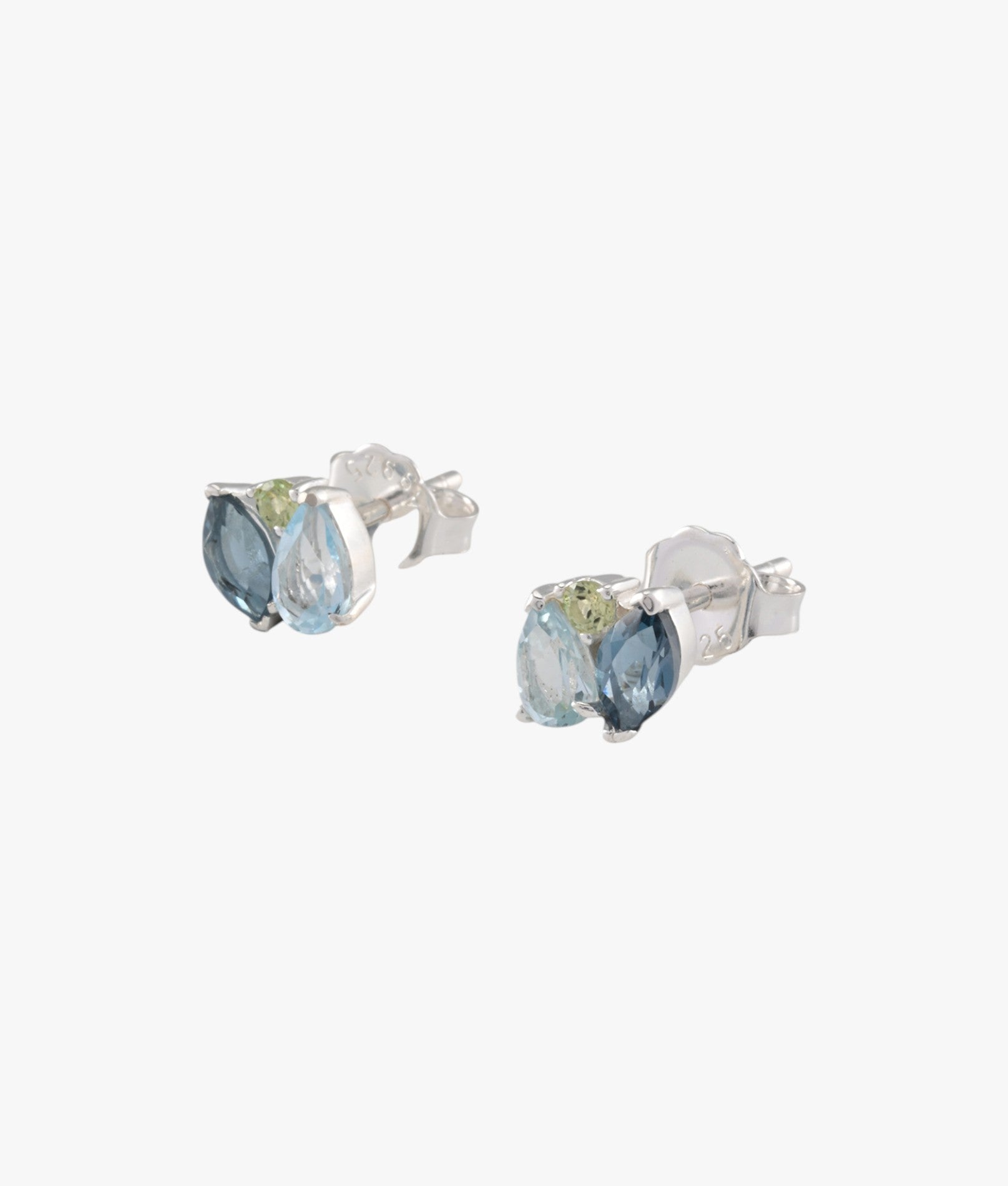 From Von Treskow’s Lime & Berry collection, these sterling silver stud earrings feature a trio of London Blue Topaz, round Peridot, and pear-cut Sky Blue Topaz. The mix of rich blue, zesty green, and airy sky tones creates a fresh burst of colour, designed for versatile, everyday styling.