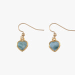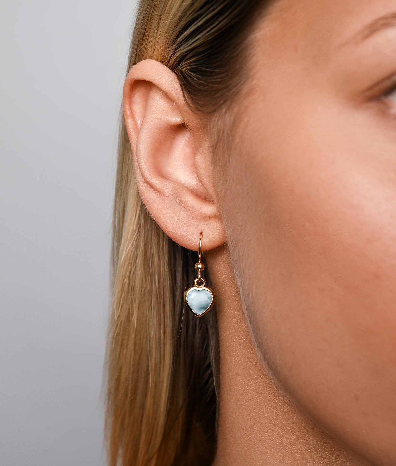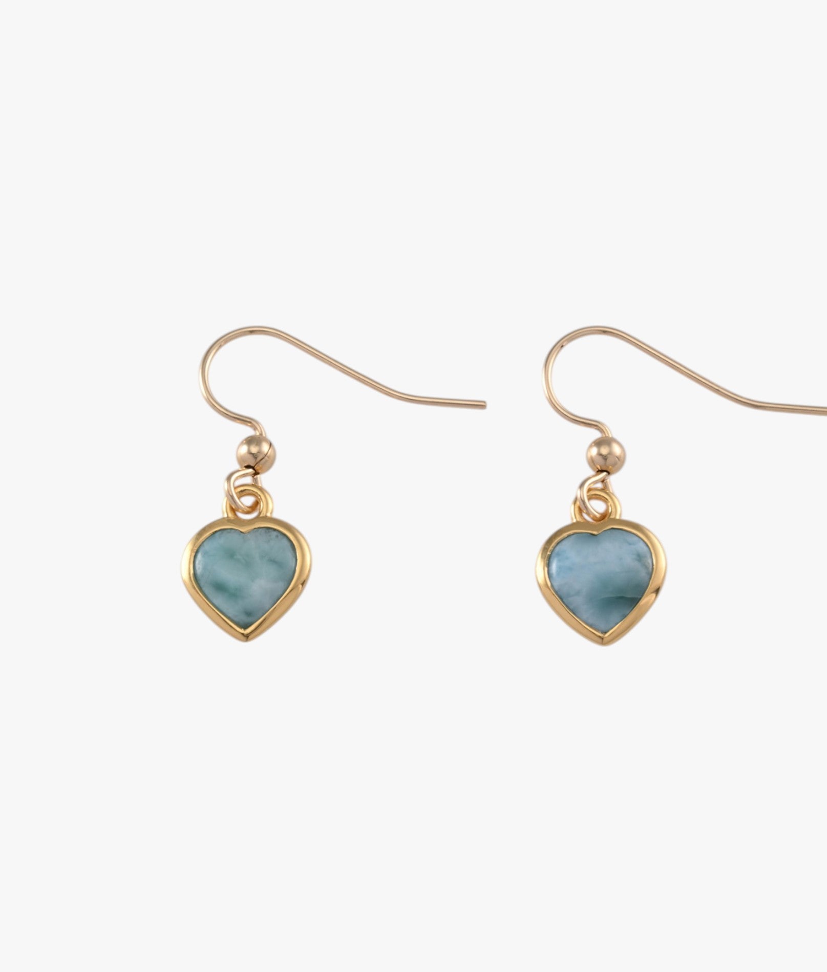 Soft colour, gentle shine. These gold filled hook earrings feature small heart-shaped Larimar charms - a gemstone formed in Caribbean volcanic rock, known for its serene ocean-blue hues. A refined design with natural warmth.