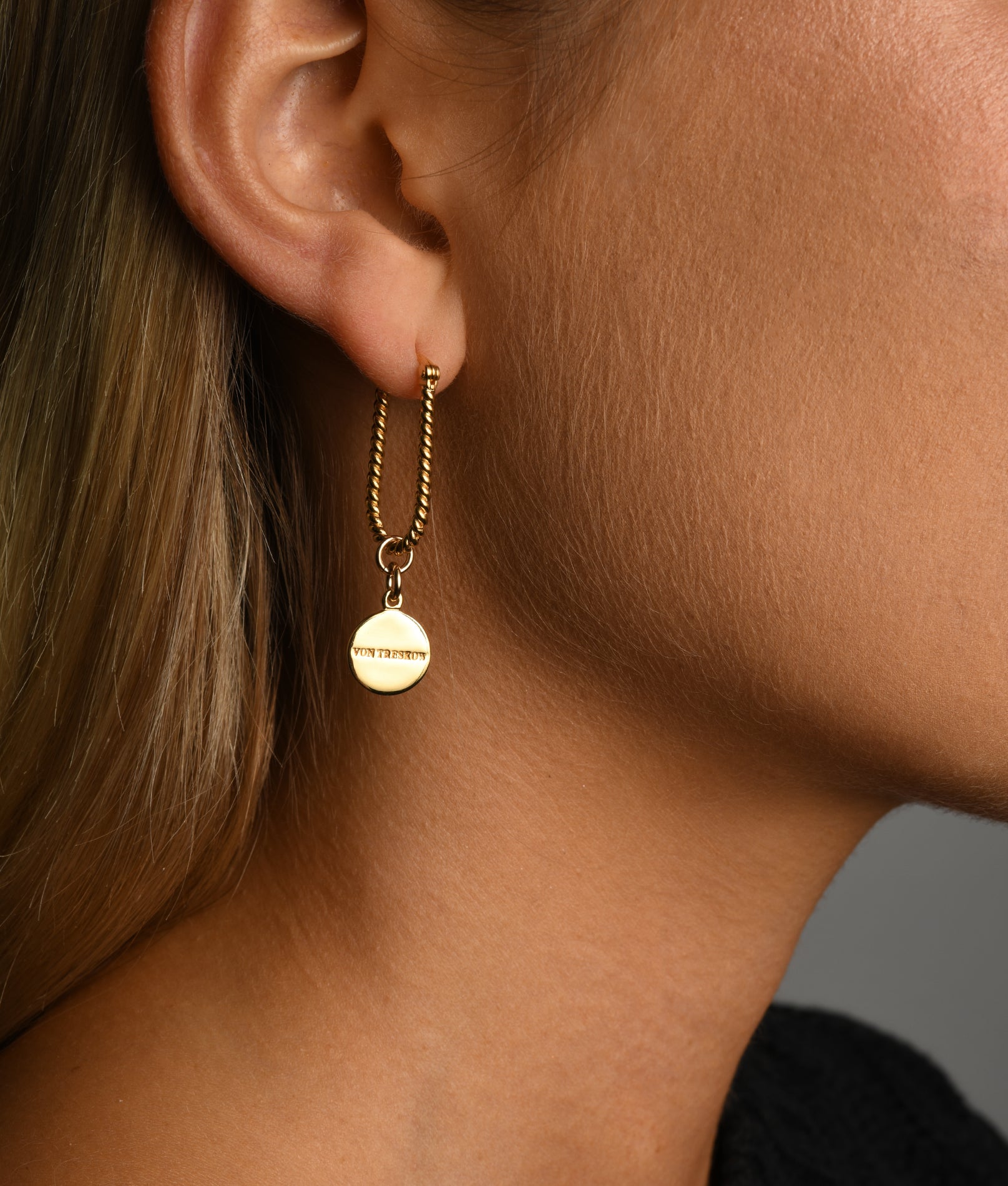 Twisted U-shape earrings with lever clasp & Von Treskow Plate charms.